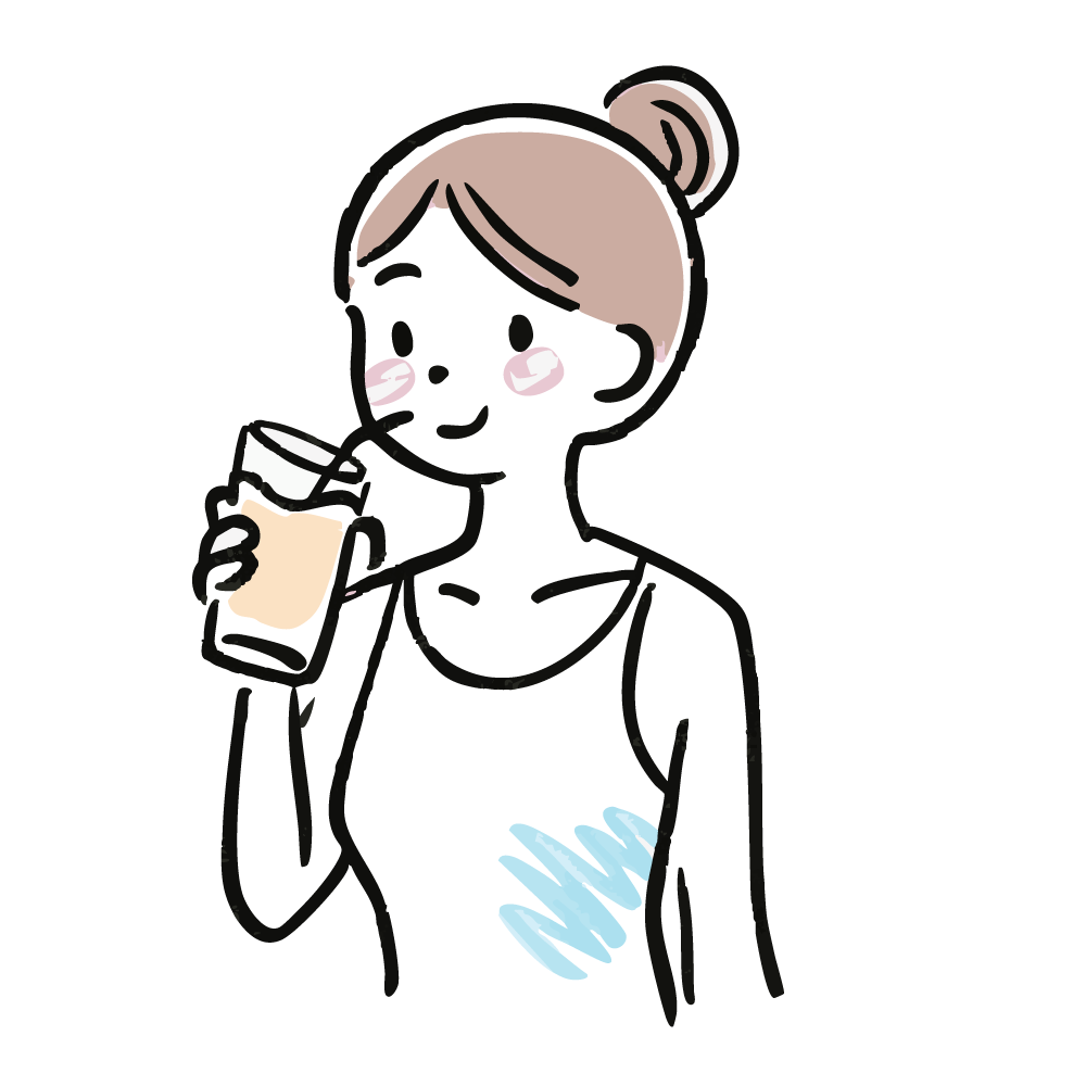 お団子ヘアの女性が、タンクトップ姿でリラックスしながら、グラスに入った飲み物(スムージーやジュース、プロテインなど)をストローで飲んでいる無料イラストです。人物の上半身が手描き風のラフなタッチで描かれています。美容、健康、ダイエット、リラックス、ライフスタイル、食事などのテーマに最適です。このフリー素材は商用利用OKで、美容・健康系メディア、ブログ、広告などに幅広くお使いいただけます。