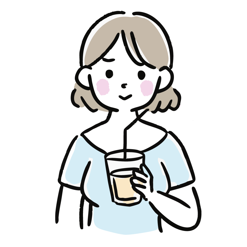 ショートヘアの女性が、グラスに入ったジュース(飲み物)をストローで持ち、笑顔でこちらを見ている無料イラストです。人物の上半身が手描き風の優しいタッチで描かれています。カフェ、休憩、ランチ、食事、飲料、ライフスタイルなどのテーマに最適です。このフリー素材は商用利用OKで、Webサイトの挿絵、ブログ、SNS投稿、チラシのデザインなど、さまざまな場面でご活用いただけます。