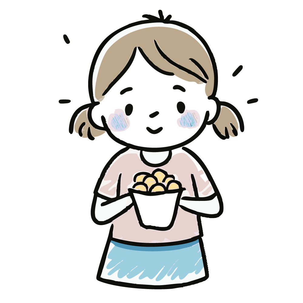 この子供のイラストは、「おやつをもらった喜び」を生き生きと表現できます。女の子のキラキラした表情が、見る人を楽しい気分にさせます。商用利用OKなフリー素材のため、お菓子やファストフードの広告、子供向けサービスのプロモーションに、コストをかけずに安心してご利用いただけます。手描き風の温かいデザインが親しみやすいです。