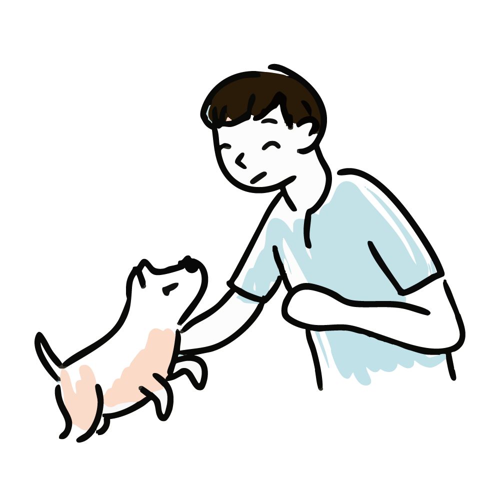 小さな犬が嬉しそうに後ろ足で立ち上がり、男性がその頭を優しくなでているシーンの無料イラストです。男性も穏やかな笑顔を浮かべており、人物とペットの間の温かい交流が伝わってきます。シンプルな線と水色・肌色などの最小限の色使いで描かれた、親しみやすい手書き風のデザインです。「飼い主」と「ペット」という関係性をシンプルに示すことができる、汎用性の高いフリー素材です。