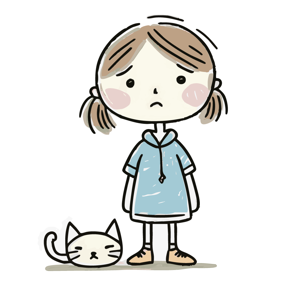 ツインテールの女の子と、1匹の白い猫が、二人とも悲しそうな、しょんぼりとした表情でこちらを見ている無料イラストです。女の子はフード付きの服を着て直立しており、猫はその足元で伏せています。手書き風のラフな線画と、青系の服や頬の赤みといった抑えた色使いが、シーンの切ない雰囲気を強調しています。人物と動物(ペット)のネガティブな感情を描いた、珍しいデザインのフリー素材です。