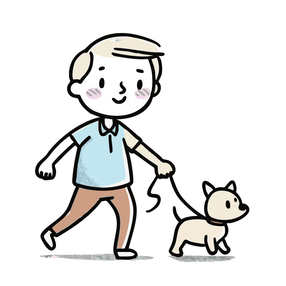 ポロシャツ姿の男性が、優しい笑顔で小さな犬の散歩をしている無料イラスト素材です。犬も楽しそうに前を向いて歩いています。人物の穏やかな表情と、水彩のような淡い色使いが、温かく平和な雰囲気を作り出しています。手書き風の親しみやすいタッチで、人物とペット(動物)の信頼関係が伝わってくるデザインのフリー素材です。