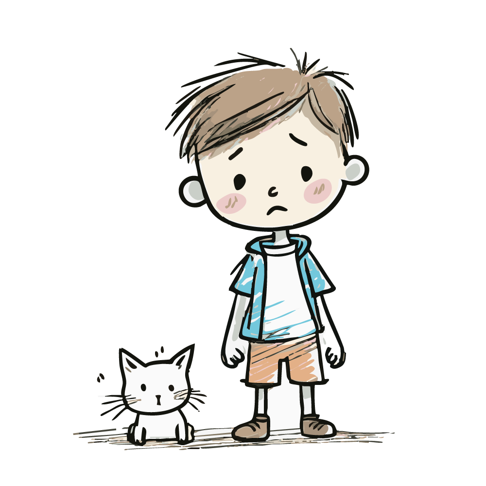 パーカーを着た男の子が、悲しそう、あるいは心配そうな表情でたたずんでいる無料イラストです。その足元には、小さな白い猫が同じように少し不安そうな顔でお座りしています。インクと水彩のようなラフな手書き風のタッチが、子供の繊細な感情と、そっと寄り添う動物(ペット)の姿を印象的に描いています。人物とペットの、言葉を超えた心の繋がりを感じさせるデザインのフリー素材です。