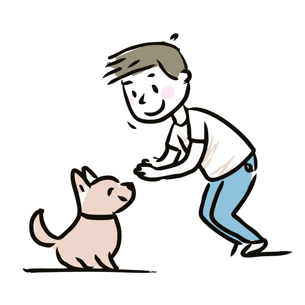 男の子がしゃがみこんで、小さな犬(子犬)と楽しく遊んでいる様子の無料イラストです。男の子は笑顔で両手を犬に向けており、犬も嬉しそうに飼い主を見上げています。まるで「おいで」と呼んでいるか、「待て」を教えているような、ペットのトレーニングやしつけの一場面にも見えます。手書き風の温かみのあるタッチで、人物と動物の微笑ましい関係性を描いたフリー素材です。