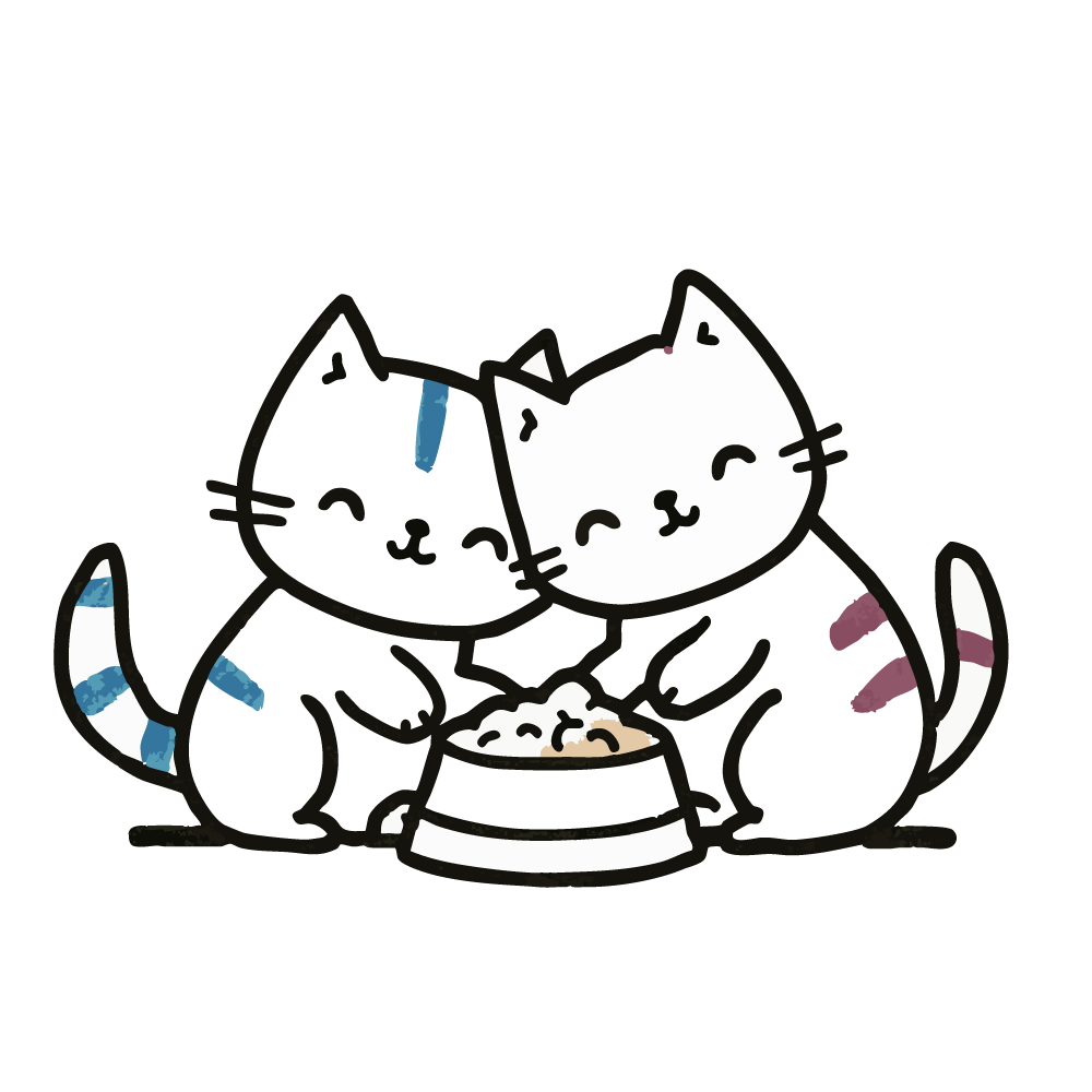 青いブチ模様の猫と、紫のブチ模様の猫の2匹が、一つのご飯ボウルを囲み、顔を寄せ合いながら仲良く食事をしている無料イラストです。2匹とも目を細めて満足そうな、幸せそうな表情をしています。手書き風の温かみのある線画が、動物(ペット)たちの平和で愛らしい瞬間を切り取っています。猫の多頭飼いの理想的な日常風景を描いた、心温まるデザインのフリー素材です。