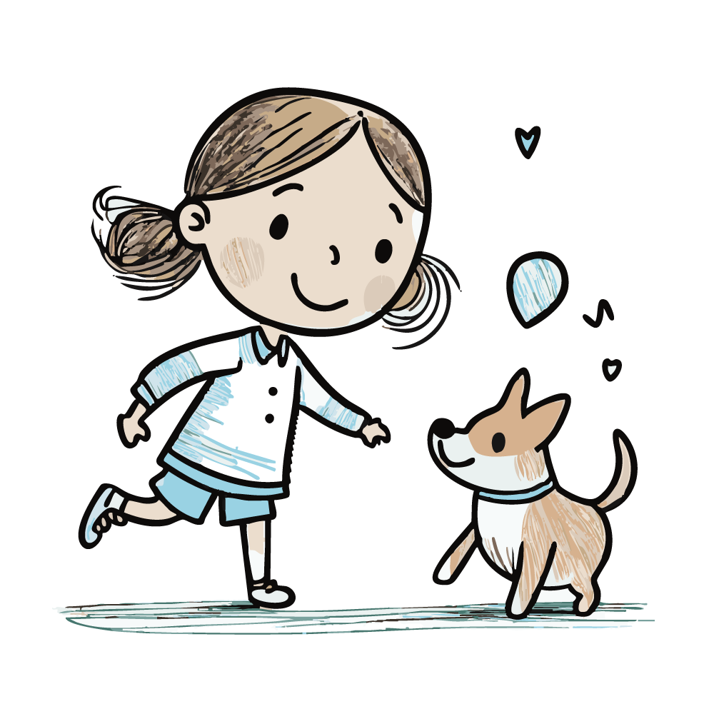 ツインテールの女の子が、茶色い子犬に向かって手を差し伸べ、楽しそうに遊んでいる様子の無料イラストです。犬も嬉しそうに女の子を見上げて飛び跳ねています。ボール遊びや追いかけっこをしているような、躍動感あふれる瞬間が描かれています。手書き風のラフなタッチが、子供と動物(ペット)の元気な日常を生き生きと伝えます。
