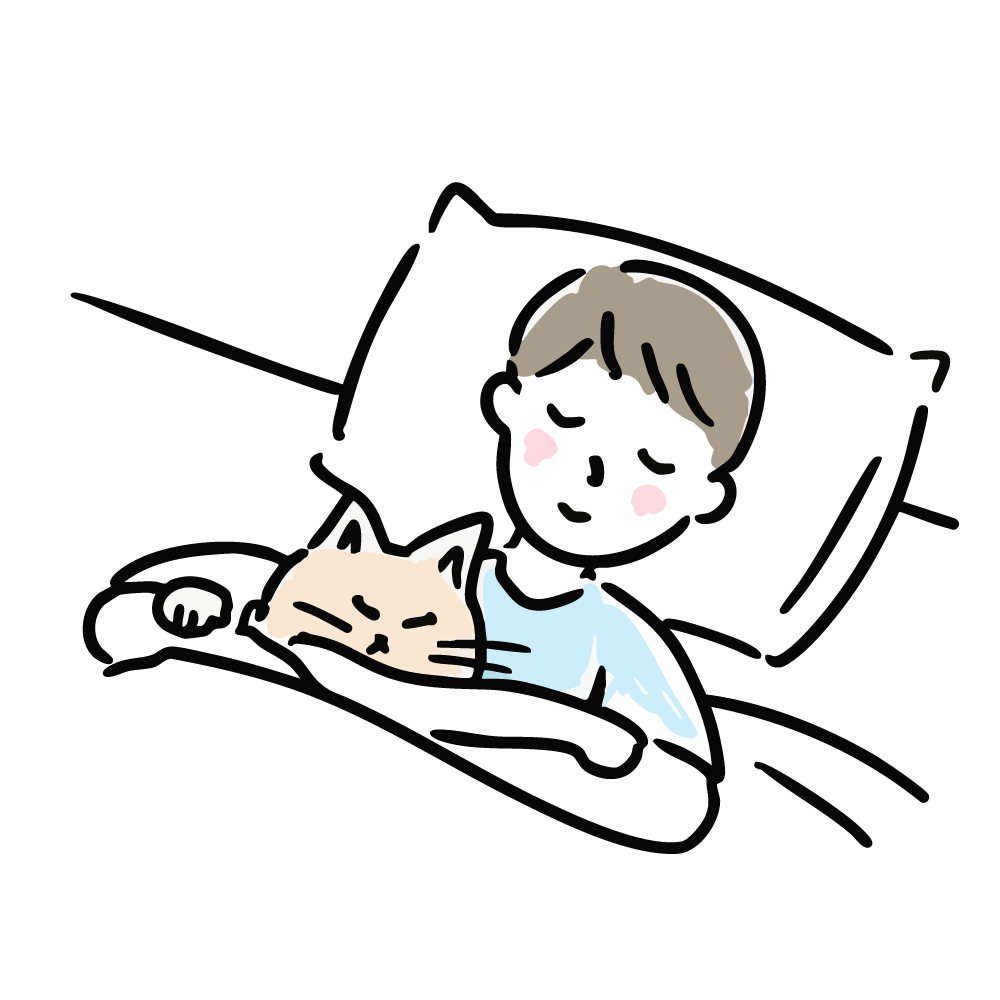 男の子が、茶色い猫を優しく抱きしめ、頬を寄せながらベッドで眠っている無料イラストです。男の子も猫も穏やかで安心しきった寝顔をしています。手書き風の温かみのある線画が、人物と動物(ペット)の間の深い絆と、安らぎの睡眠時間を表現しています。心温まる、癒しのデザインのフリー素材です。