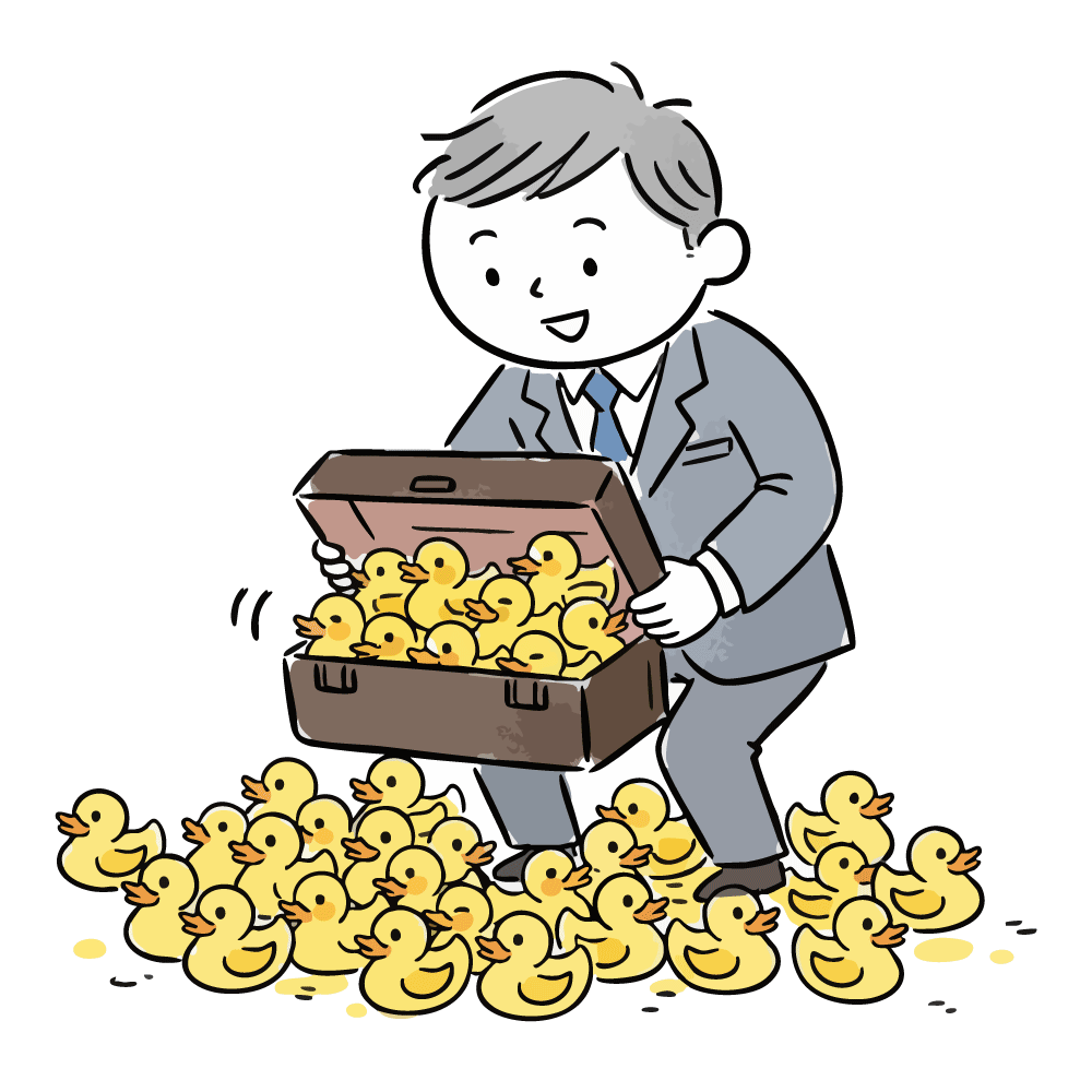 スーツ姿のビジネスマンが、開けたアタッシュケースから溢れ出す大量の黄色いアヒルのおもちゃに、嬉しそうながらも少し驚いているような表情を浮かべているユニークな無料イラストです。アヒルたちはケースの中だけでなく、彼の足元にもいっぱいに広がり、非現実的でコミカルな状況を生み出しています。真面目なビジネスシーンと、かわいらしいアヒルのおもちゃという、まったく異なる要素のギャップが印象的なデザインです。予想外の出来事、隠された趣味、または「大量発生」といった状況をユーモラスに描いています。