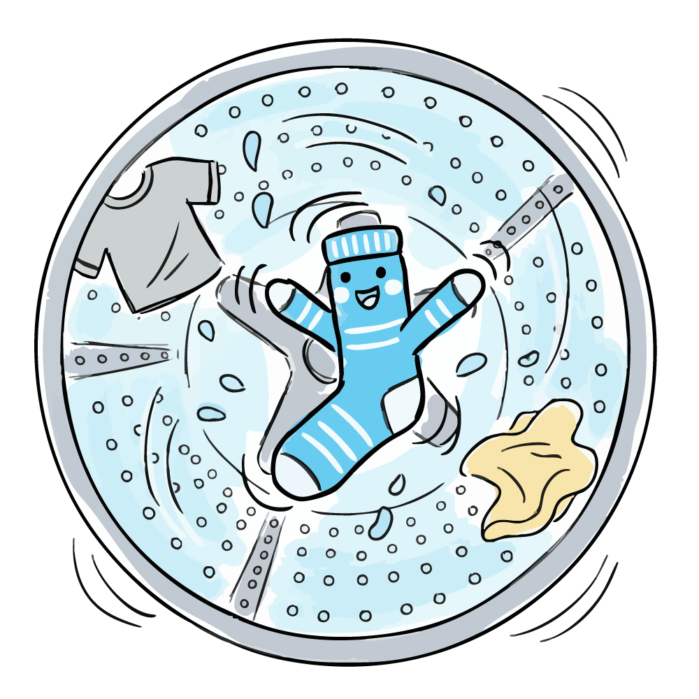 洗濯機で楽しそうに回る靴下のフリーイラスト