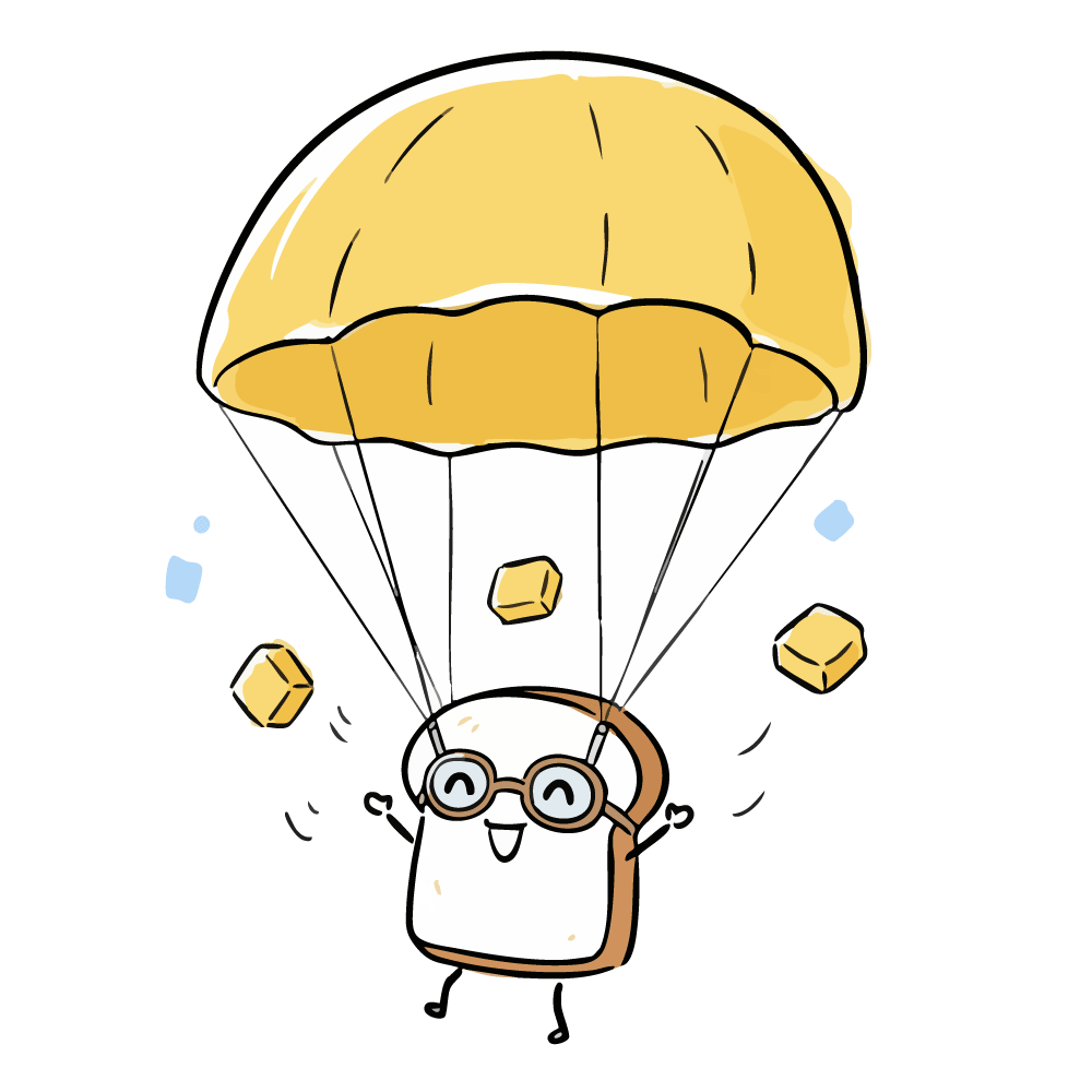 擬人化されたかわいい食パンのキャラクターが、大きなチーズ(またはバター)をパラシュート代わりにして、空からふわりと降りてくる様子を描いた、ファンタジックな無料イラストです。食パンはゴーグルをつけ、両手を広げて大喜びしており、冒険を楽しんでいるようです。彼の周りには、小さなバター(またはチーズ)のキューブが一緒に浮かんでおり、美味しそうで楽しい雰囲気を一層高めています。「美味しい朝食が空からやってくる」といったイメージを連想させる、遊び心あふれるデザインです。