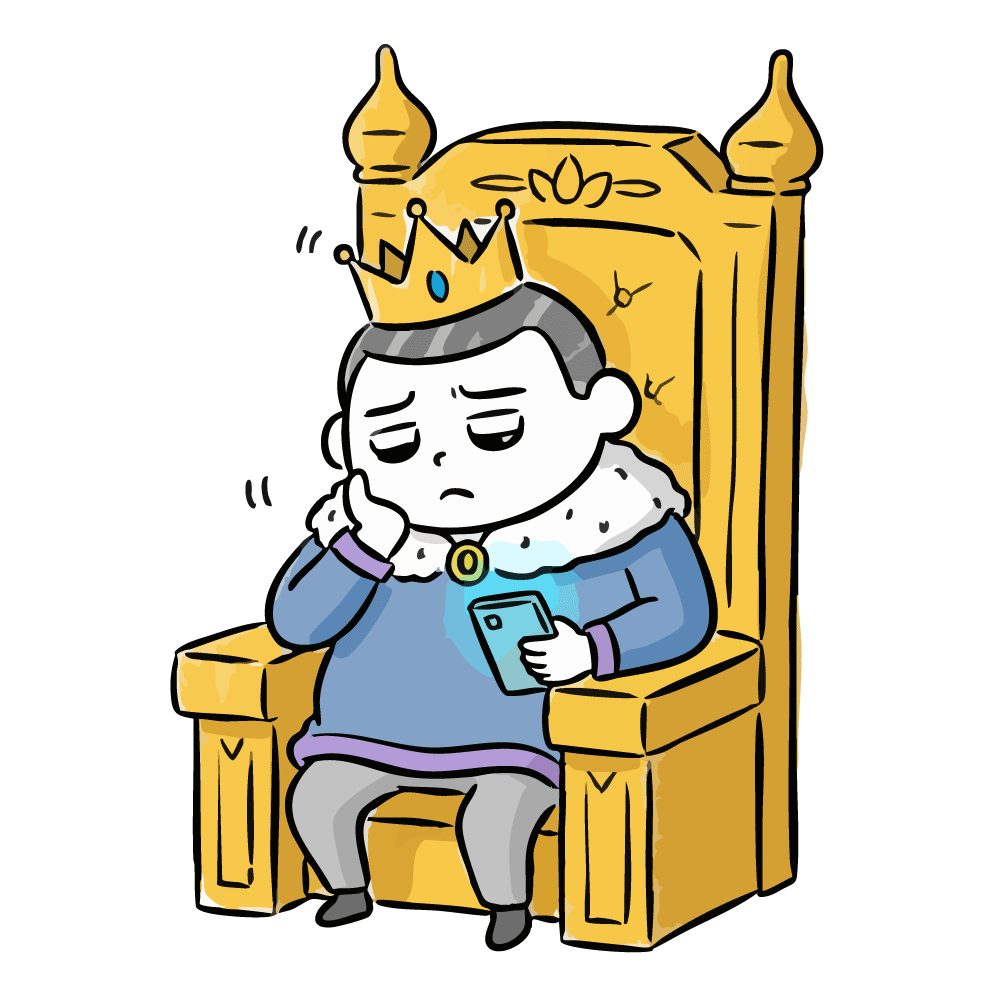 伝統的な王冠と豪華な衣装を身に着けた王様が、立派な玉座に深く腰掛け、なんとも退屈そうな表情でスマートフォンを眺めている、コミカルな無料イラストです。王様は頬杖をつき、目はうつろで、明らかに「暇」を持て余している様子が伝わってきます。絶対的な権力者である「王様」と、現代人が手放せない「スマートフォン」、そして「退屈」という感情の組み合わせが、ユーモラスなギャップを生み出しています。現代社会の「スマホ依存」や「時間の使い方」を、歴史的なモチーフを使って風刺したようなデザインです。