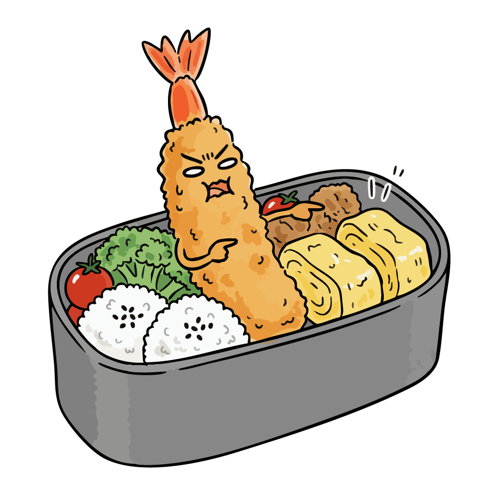 定番のお弁当箱の中に、ご飯、ブロッコリー、トマト、卵焼き、ミートボールといった美味しそうなおかずが詰められています。しかし、その中心にいる主役であるはずのエビフライが、なぜか擬人化され、非常に怒った表情を浮かべています。腕組みをし、何かを指差して激しく抗議しているかのようです。他の食材とのギャップが非常にコミカルで、見た人の想像力をかき立てます。「主役の座を奪われた?」「味が気に入らない?」など、様々なストーリーを連想させる、ユニークで楽しい無料イラスト素材です。