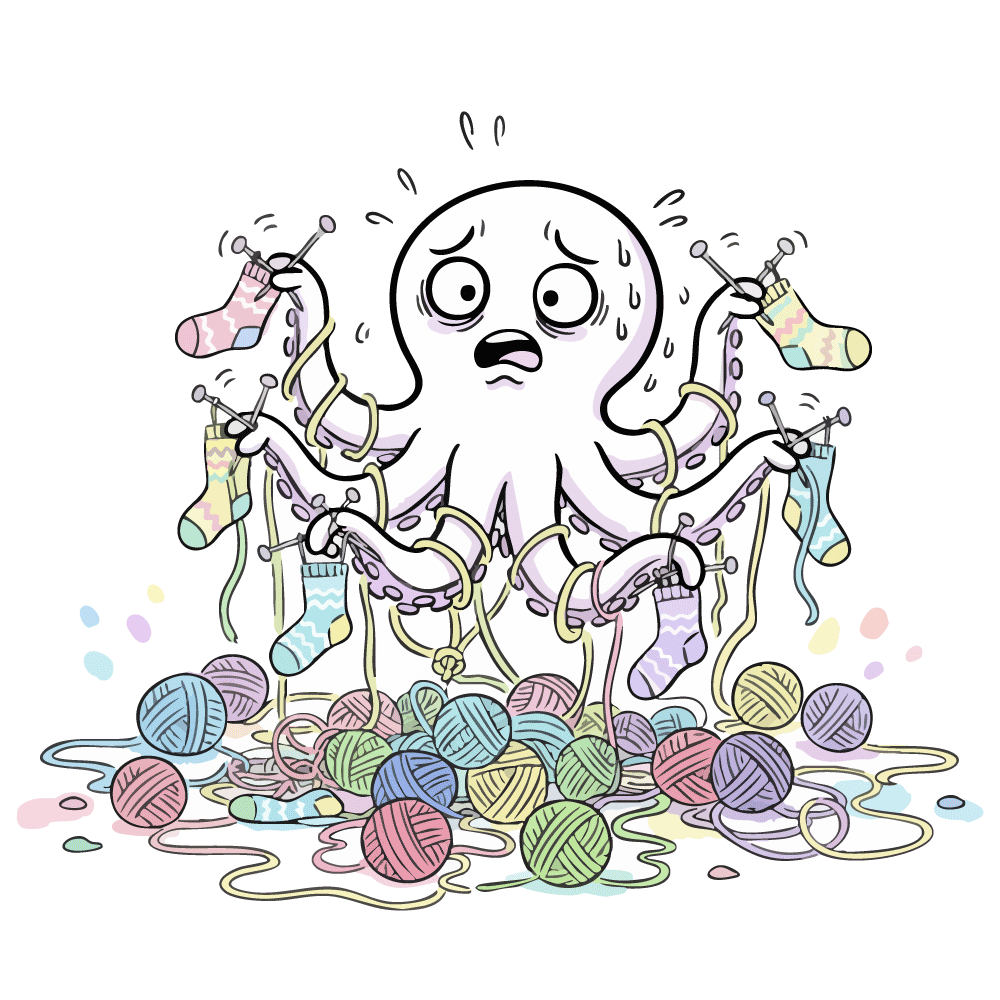 器用なはずの8本足を持つタコが、大量のカラフルな毛糸玉に囲まれ、編み物に挑戦している無料イラストです。しかし、その結果は惨憺たるもの。タコは8本の足すべてに編み針を持ち、6足の靴下を同時に編もうとしているようですが、毛糸は複雑に絡み合い、どうにもならない状況に陥っています。タコ自身も冷や汗をかき、目を丸くして完全にパニック状態です。「手(足)が多いからといって器用とは限らない」というマルチタスクの難しさや、キャパシティオーバーの状況をコミカルに描いています。