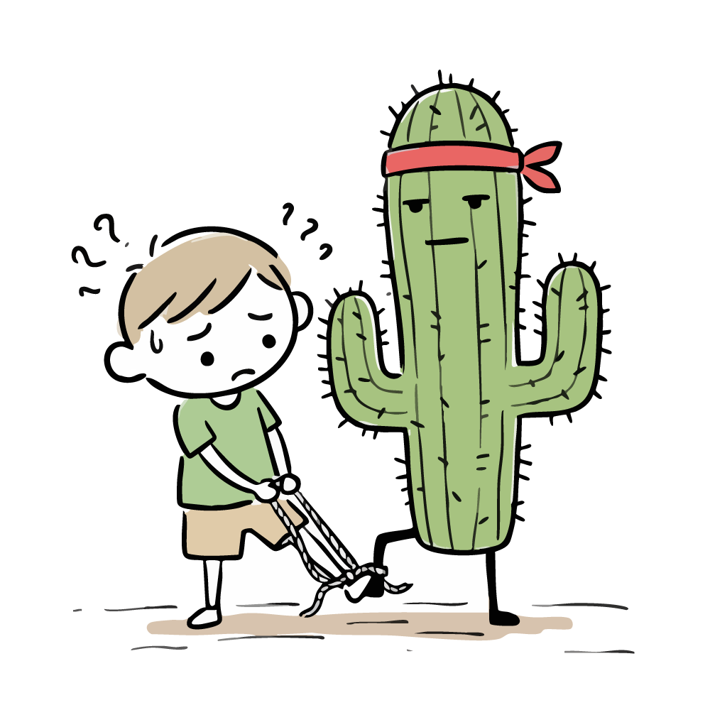 鉢巻を締めた頑固そうな表情のサボテンと、その足(根元)に縄をかけようとして「???」と困惑している少年の姿を描いた、シュールな無料イラストです。なぜ少年がサボテンを引っ張ろうとしているのか、なぜサボテンがこんなに堂々としているのか、想像力をかき立てるユニークなフリー素材です。「動かない」「頑固」「理解不能」といった状況の比喩表現に最適です。