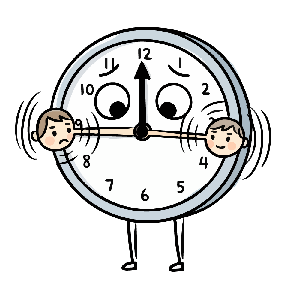 擬人化された時計が、12時を指したまま焦った表情を浮かべている無料イラストです。時計の長針と短針(9時と4時を指している)は、それぞれ人間の頭を掴んで振り回しており、時間に追われる多忙さやプレッシャーをコミカルに表現しています。締め切り間近、残業、タイムマネジメントの失敗といったビジネスシーンや、忙しい日常のテーマに最適なフリー素材です。