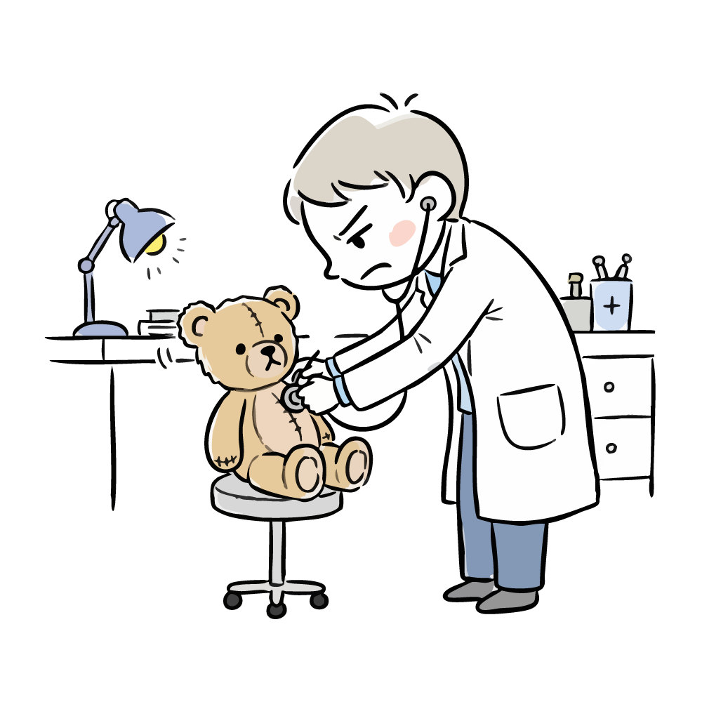 テディベアを真剣に診察するお医者さんの無料イラスト