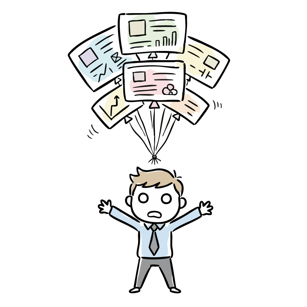 ワイシャツとネクタイ姿のビジネスマンが、グラフや書類が描かれたたくさんのパネル(風船のように紐でまとめられている)に引っ張られ、宙に浮いて慌てている無料イラストです。これは、抱えきれないほどの多くのタスク、案件、情報に振り回されている状態を視覚化したものです。多忙、キャパオーバー、マルチタスクの限界などを表現するのに最適なフリー素材です。