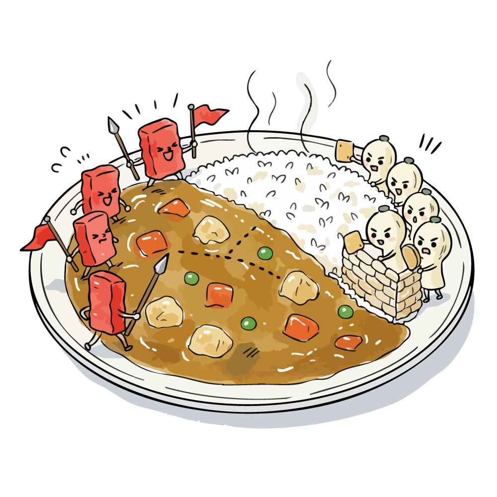 お皿に盛られたカレーライスの上で、擬人化されたカレールー(赤い四角)の軍隊と、福神漬け(白いキャラ)の軍隊が、ご飯を境界線にして激しく戦っている無料イラストです。ルー軍は槍や旗を持ち、福神漬け軍は壁を作って応戦しています。食べ物の好みの対立、ランチタイムの攻防、あるいは単なるユーモラスな「対立・競争」の比喩として使える、非常にユニークなフリー素材です。
