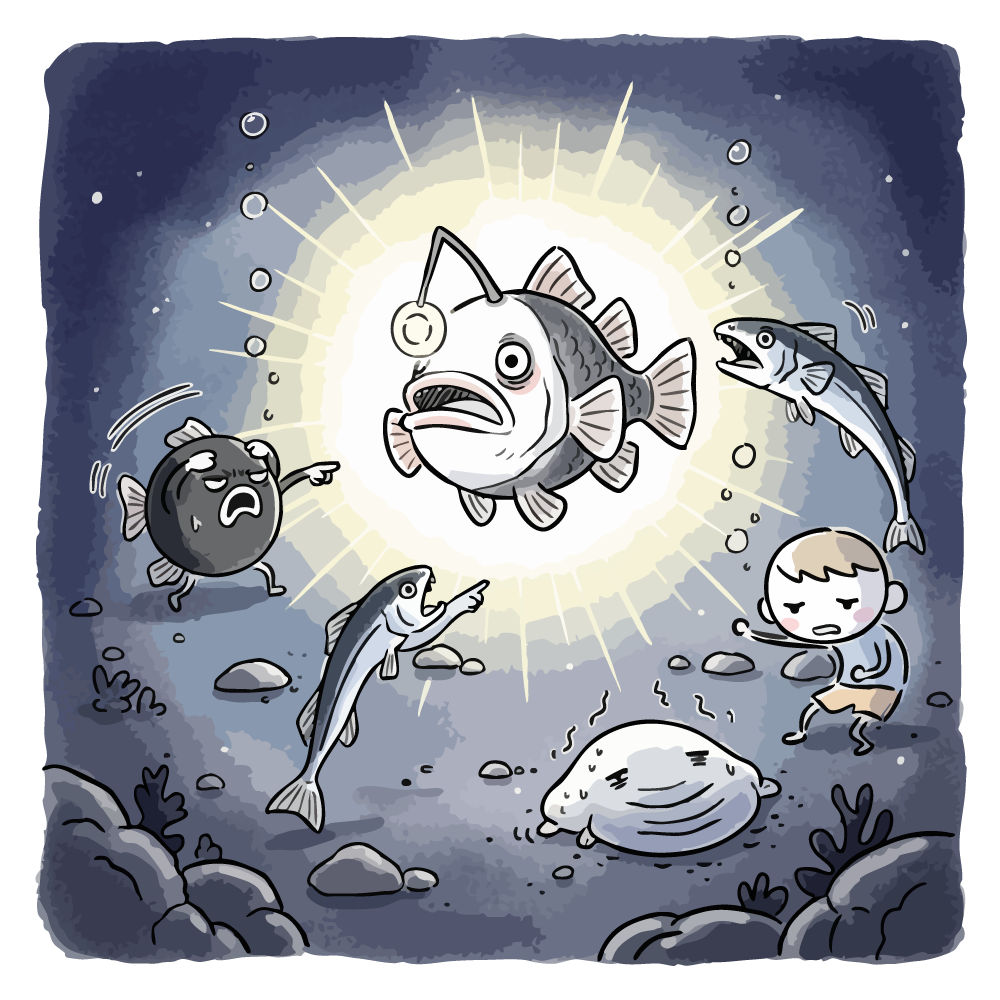 暗い深海の海底で、一匹のチョウチンアンコウが、頭の提灯で自ら明るく輝いている無料イラストです。その光に惹かれて、周りの魚たちや、なぜか深海にいる少年までもが、驚いたり指を差したりして注目しています。このイラストは、深海魚の生態を描くだけでなく、「注目を浴びる存在」「スポットライトが当たる」「人気者」「他とは違う才能」といった状況の比喩表現としても使える、ユニークなフリー素材です。