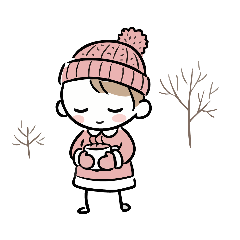 ピンク色のニット帽、セーター、手袋でしっかりと防寒した女の子が、寒い屋外で温かい飲み物の入ったマグカップを両手で大切そうに持っている無料イラストです。背景には雪景色を思わせる枯れ木が描かれ、冬の寒さと飲み物の温かさを対比させています。2025年の冬の訪れを告げるお便りや、風邪予防、防寒対策の啓発、カフェの冬メニュー(食べ物)紹介などに最適なフリー素材です。