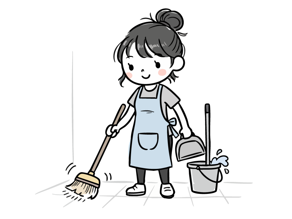 エプロンを着用し、ほうきで床を掃き、もう片方の手にちりとりとバケツを持った女性清掃員のフリーイラスト素材です。お団子ヘアの可愛い女性が、笑顔で丁寧に掃除する様子が描かれています。手書き風のおしゃれなタッチが、清掃サービスやハウスクリーニングの清潔感を親しみやすく伝えます。この無料素材は、清掃会社のウェブサイト、サービス紹介、お掃除コラム、求人情報などにぴったり。登録不要で簡単ダウンロードでき、商用利用OKなので幅広くご活用いただけます。