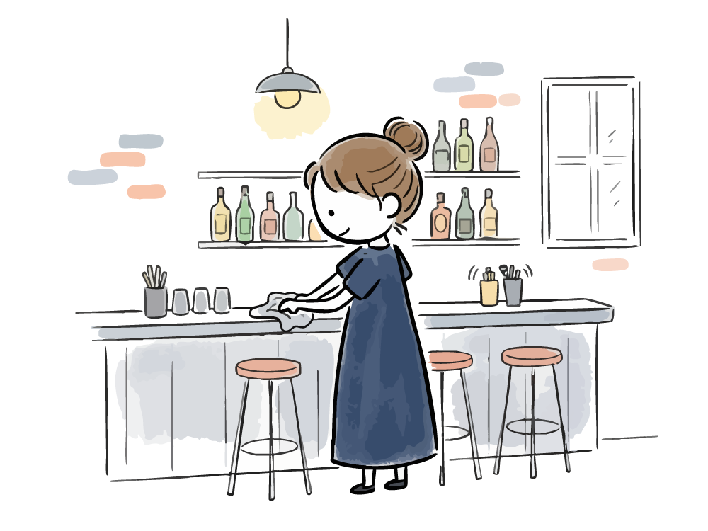 バーでグラスを拭く女性店員(バーテンダー)のかわいいフリーイラスト【商用利用OK】