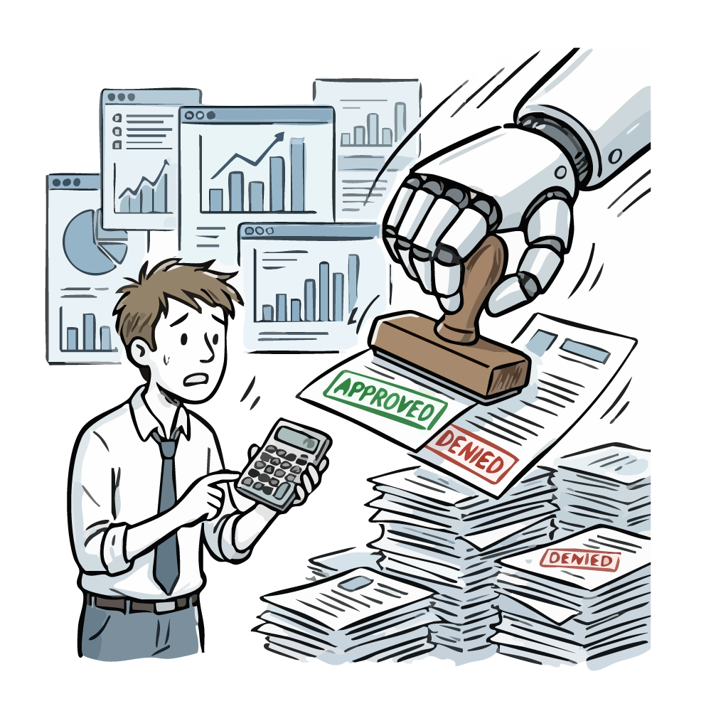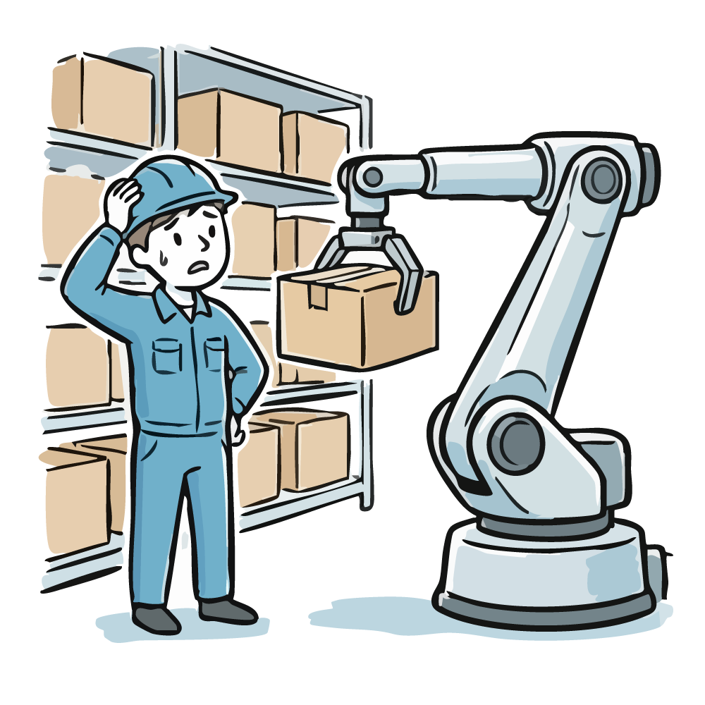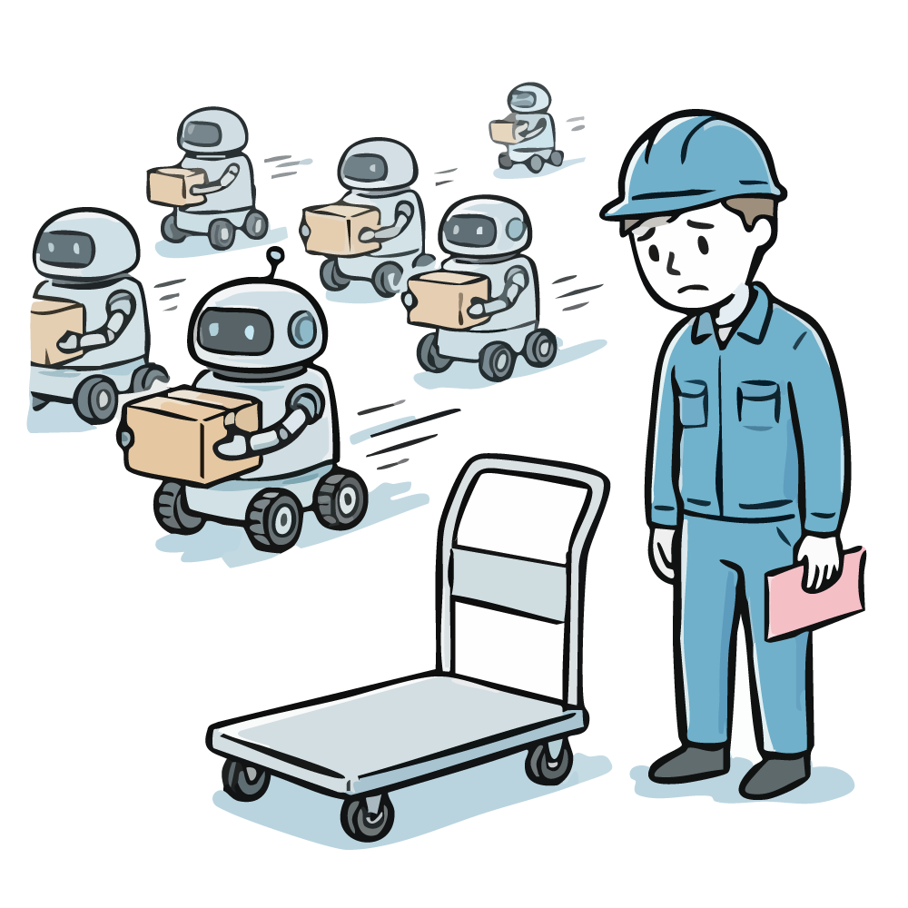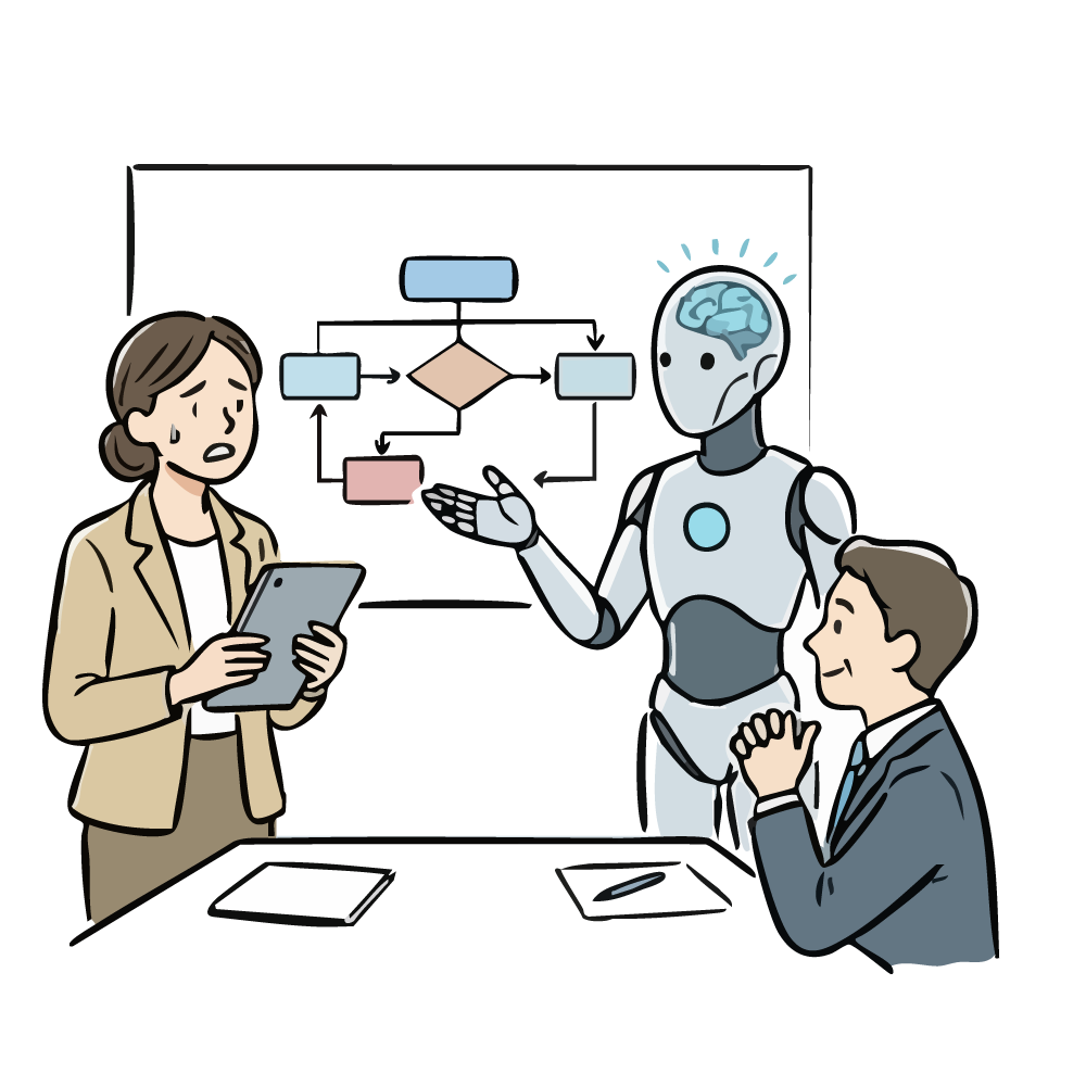 巨大なロボットに遭遇し、恐怖を感じて後ずさりするオフィスレディのイラストです。AIやテクノロジーの急速な進化に対する漠然とした不安や、人間の職業が脅かされる心理を表現しています。シンプルでかわいい手書き風のタッチにより、シリアスなテーマでも威圧感を与えすぎず、ブログや記事のさし絵として使いやすいデザインです。商用OKで登録不要、誰でも簡単にダウンロードして、資料作成やWebサイトのアクセントとして無料でご利用いただけます。