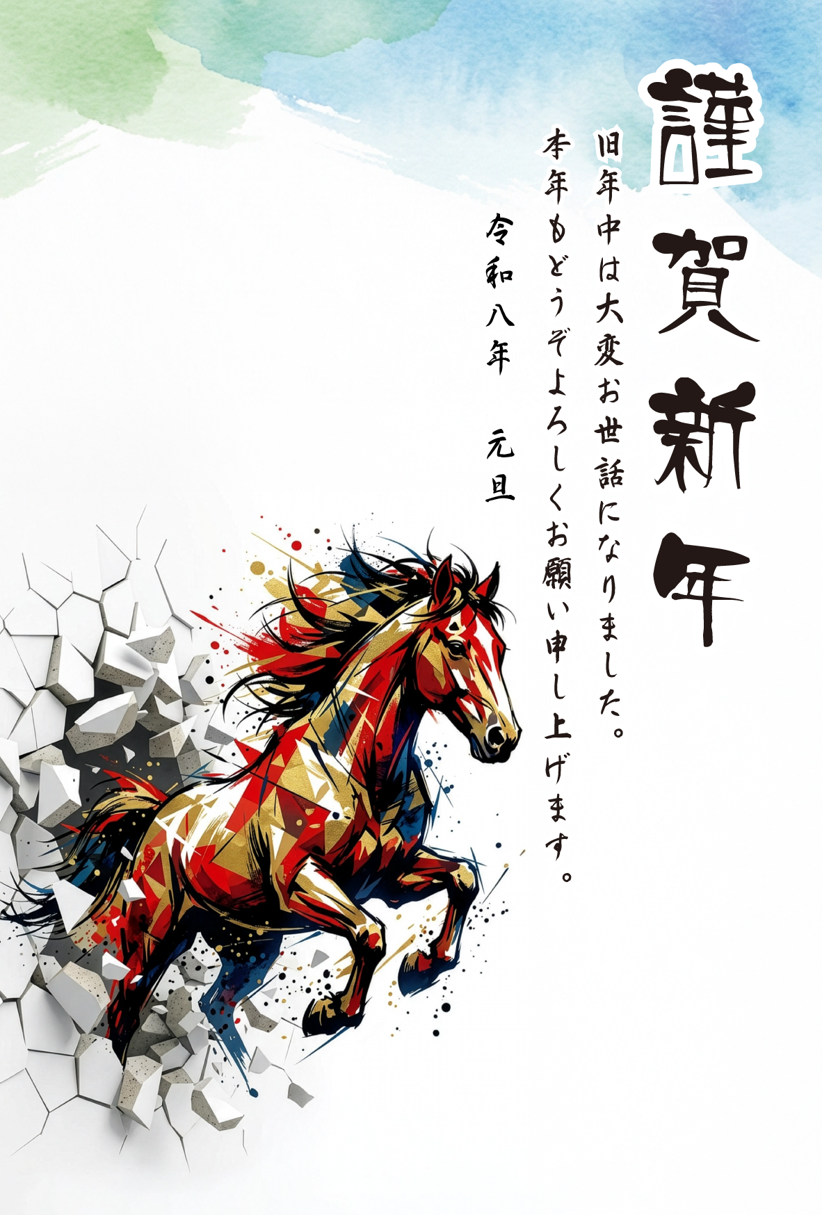 令和8年の新春を飾るのにふさわしい、壁を突き破って飛び出してくるような躍動感あふれる午(うま)のイラストです。ビジネスの現場で求められる「勢い」や「現状打破」を表現した、力強くかっこいいデザインとなっています。鮮やかな色彩が目を引くこの年賀状は、受け取った相手に強いインパクトを与えるでしょう。おしゃれでスタイリッシュな挿絵として、企業の挨拶状にも最適です。登録不要ですぐにダウンロードでき、商用OKなので安心してご利用いただけます。印刷やプリントにも適した高解像度のフリー素材です。