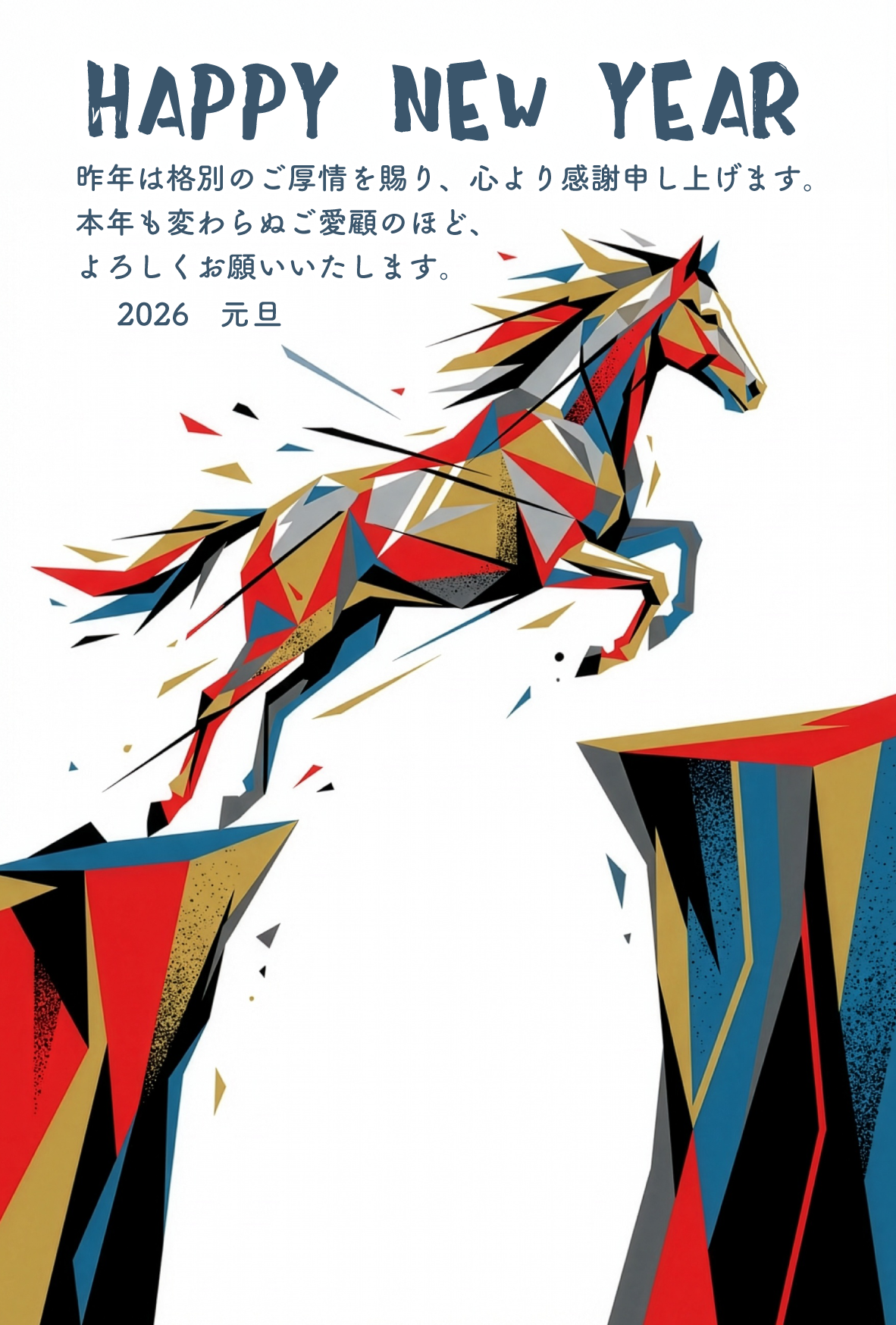 このテンプレートを使用する最大のメリットは、御社の「挑戦する姿勢」や「変革」を視覚的にアピールできる点です。干支である馬が障害物を突破する構図は、新規事業の立ち上げや飛躍を目指す年の挨拶として非常に縁起が良いデザインです。ありきたりなフォーマットではなく、少し攻めたステッカーのようなアート性を取り入れたい場合に最適です。完全無料の素材なので、コストを抑えつつ質の高い年賀状を作成できます。