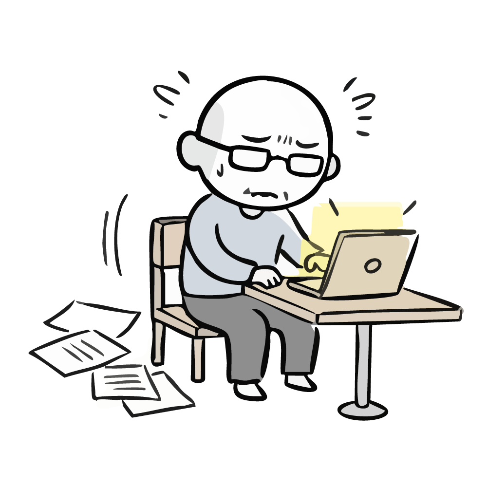 A free illustration material of a man who has started matchmaking, sitting at his laptop and struggling to create his dating app profile. The man has a tired expression, and papers are scattered around him, showing he's agonizing over his self-introduction and photo selection. This expresses that for men in their 30s, 40s, and 50s, creating a profile—the first step of matchmaking—can be a 'tough' task. It can be used as a scene showing the effort put into marriage.