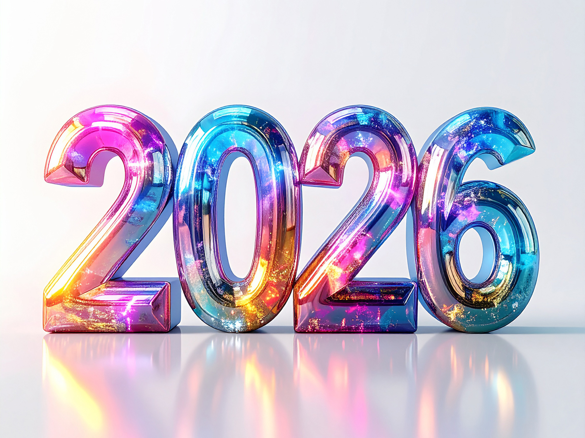 A design where the number '2026' with a metallic texture sits in a clean white space. Complex light reflections like a rainbow are depicted on the surface, giving a futuristic and artistic impression. The simplicity of stripping away excess decoration conversely highlights the stylish and cool atmosphere. The high-resolution data of 2000 x 1500 pixels clearly shows even the details of the luster. As a background material that fits well with any design, it leads creative productions to a higher level of finish.