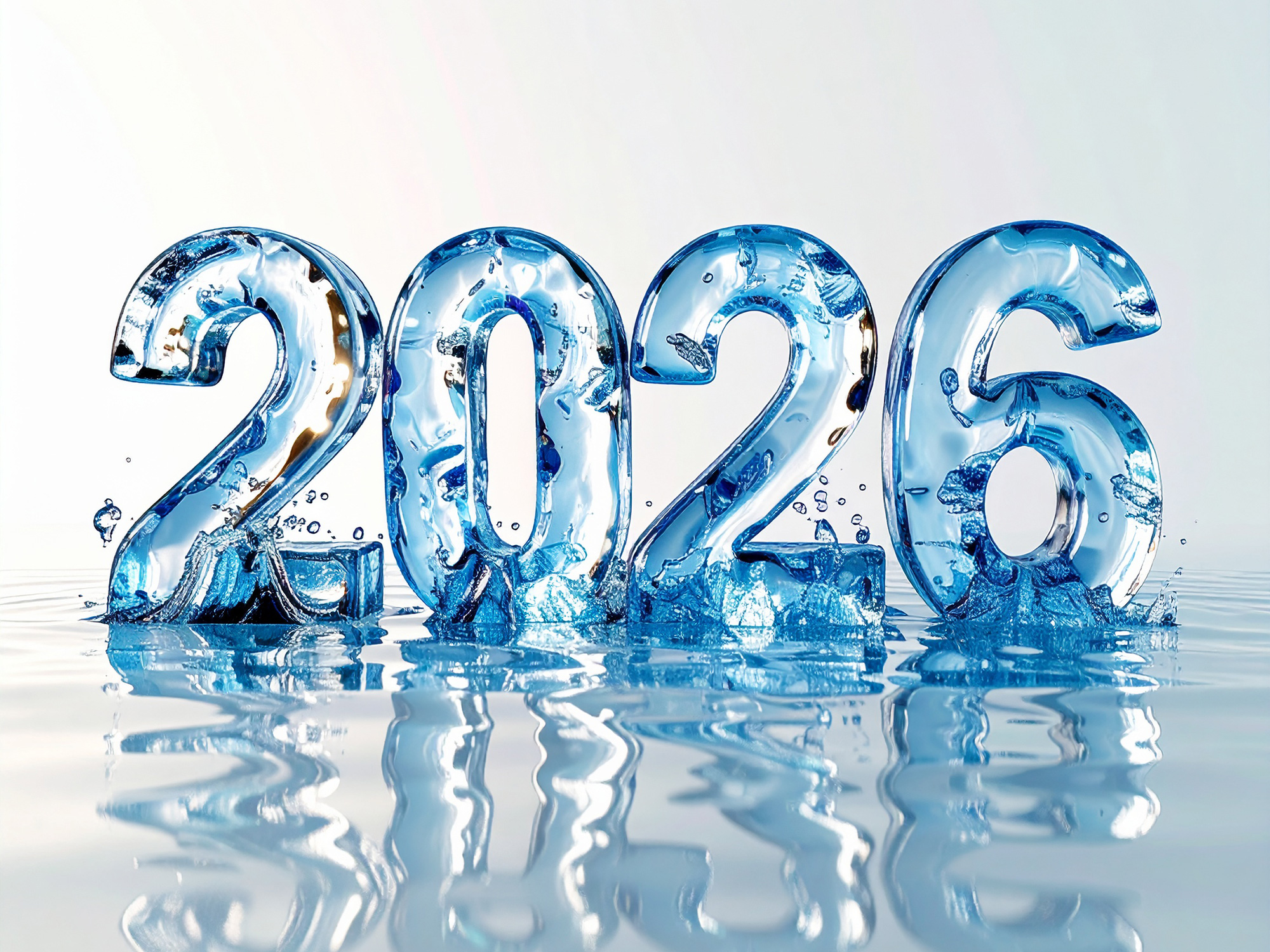 An illustration where the text '2026' full of transparency, looking as if carved from 100% pure ice, stands on the water surface. Melting water drops and splashing water make you feel movement despite being a still image. The texture of ice transmitting light and the reflection on the water surface are very beautiful, giving a sophisticated impression. This material drawn in high resolution of 2000 x 1500 pixels is clear and sharp down to the details. It is the optimal background for expressing the fresh atmosphere of the New Year and a 'clean' image of resetting and starting anew.