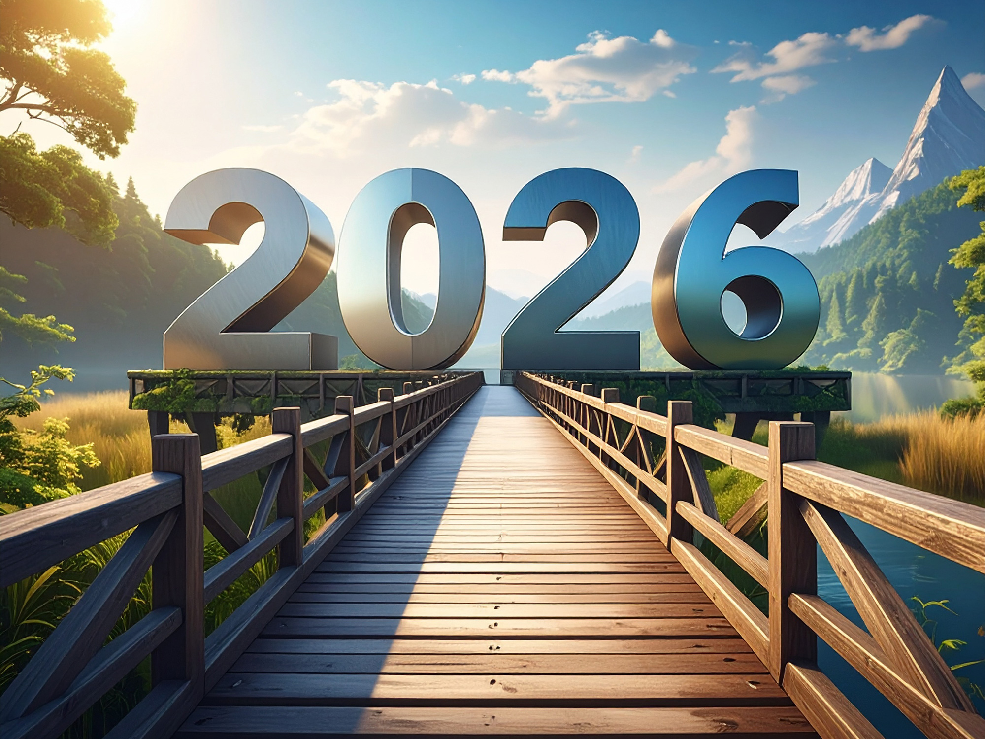 A landscape illustration depicting a wooden pier stretching over a quiet lake and a huge '2026' monument sitting at the end. Majestic mountains and trees spread in the background, and the soft morning sun illuminates the whole. It is a stylish design where the texture of metallic numbers and the organic warmth of nature fuse. Realistically depicted down to wood grain details and water surface reflections in 2000 x 1500 pixels high resolution. It is a background image with a story reminding of the path to the new year and departure to the future.