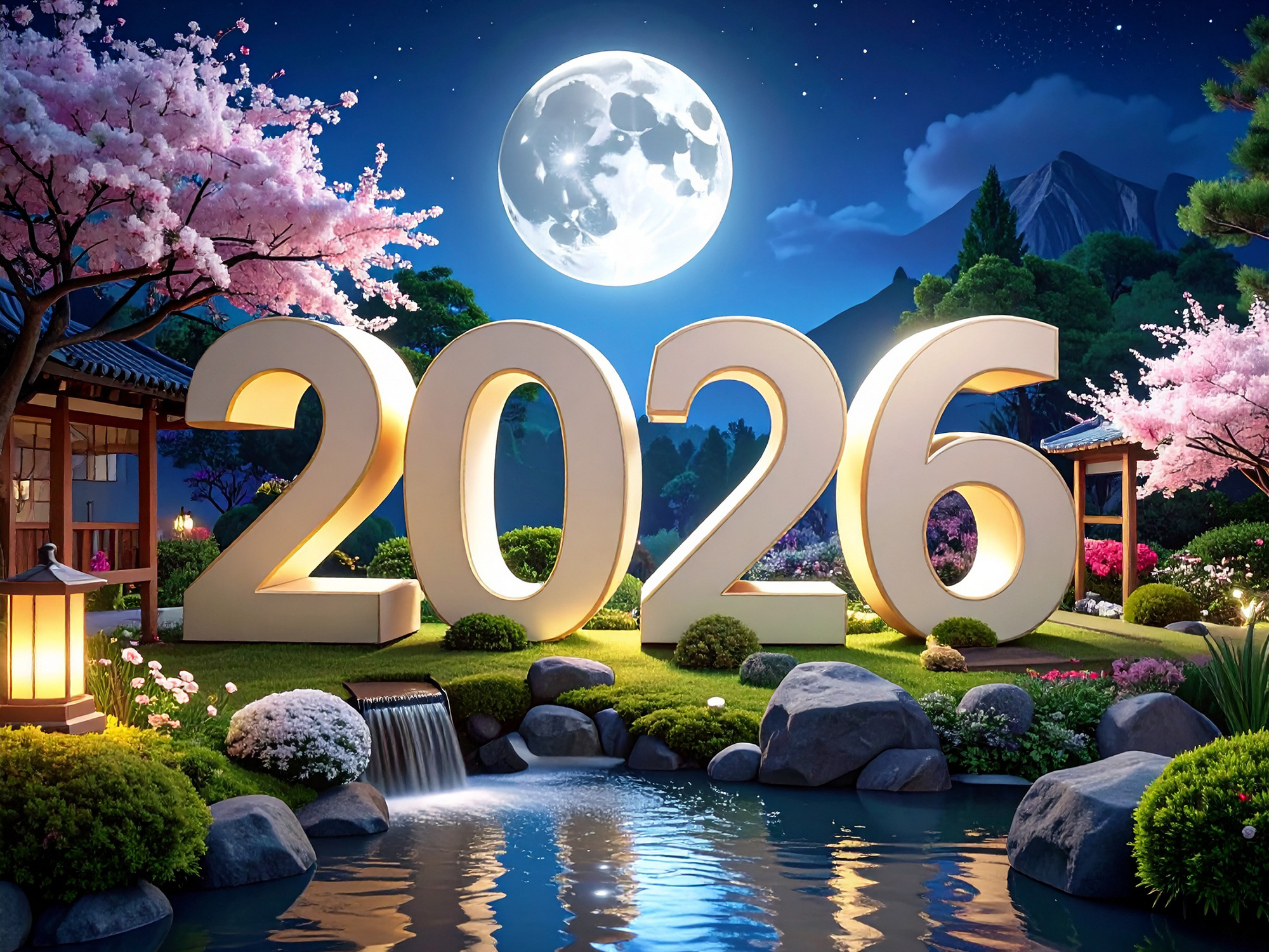 Simple and modern '2026' white text is placed in a beautifully maintained Japanese garden. A large full moon shines in the night sky, and full bloom cherry blossoms (Sakura) and lantern lights create a fantastic Japanese world. Richly emotional depiction down to details such as reflection on the pond water surface and mountain ridges visible in the distance. The 2000 x 1500 pixels high-resolution image is optimal for printed New Year cards and Japanese style designs for websites. It is a stylish piece that makes you feel the arrival of a new spring amidst silence.