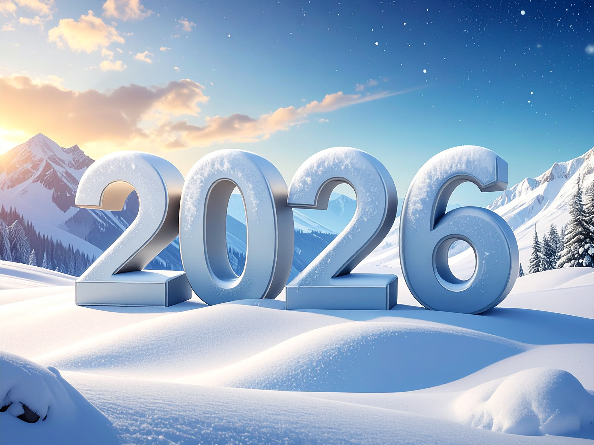 Large white '2026' text, looking like it was made by hardening snow or covered in snow, is placed in a silver world. Majestic snowy mountains line up in the background, and soft light like morning glow colors the sky. The fluffy texture of snow and shading due to light are very beautiful, a design feeling warmth amidst cold. Detailed expression down to powder snow in 2000 x 1500 pixels high resolution. It is stylish and clean material suitable for announcing the arrival of the winter season.