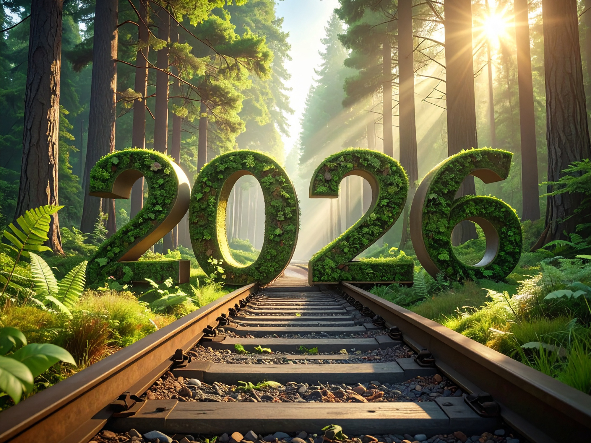 An illustration where '2026' text covered with plants and moss is placed like a gate on tracks leading into a deep forest. Divine sunbeams shine from between tall trees, making green leaves shine. A mystical and nostalgic atmosphere drifts like wandering into a Ghibli movie or fairy tale world. Finely drawn down to sleeper texture and fern leaves in 2000 x 1500 pixels high resolution. It is stylish material with a narrative quality reminding of the beginning of an adventure or return to nature.