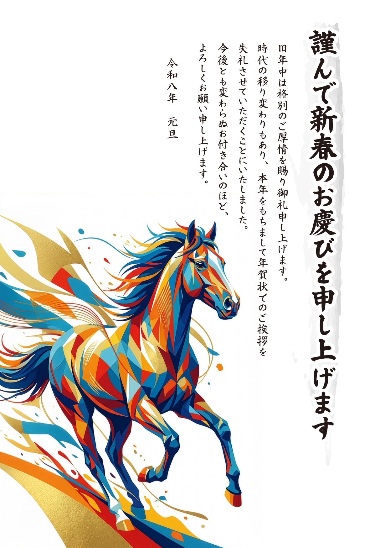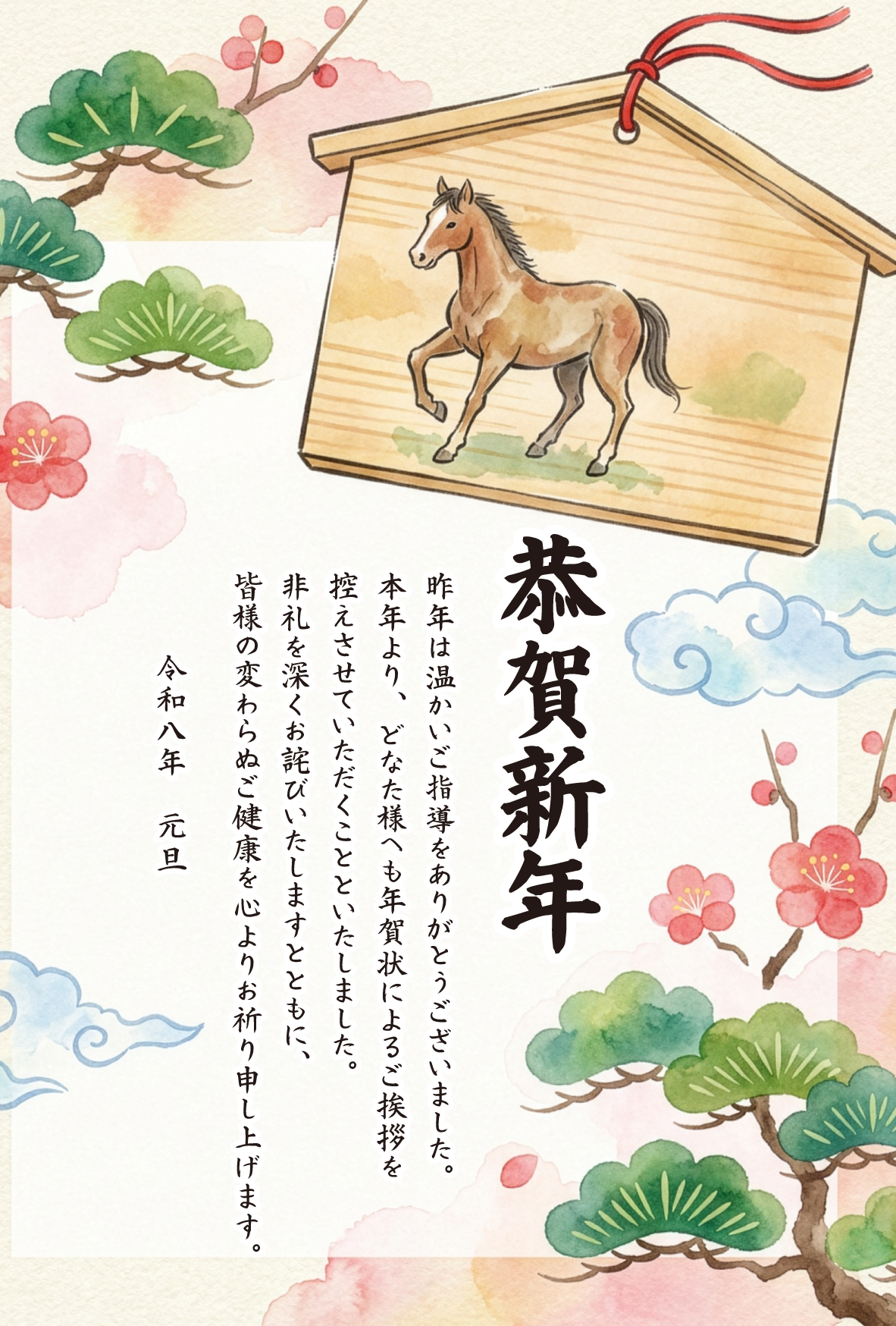 令和8年(2026年)のお正月に向けた、年賀状じまいの挨拶状画像です。着物を着たかわいい馬が丁寧にお辞儀をしている手書き風のデザイン。文面は汎用的な内容で、「本年をもちまして」という区切りの挨拶が文章付きで入っています。商用OKで登録不要、誰でも簡単にダウンロードして印刷可能です。干支のイラストが入った親しみやすい雰囲気で、最後のご挨拶を温かく伝えます。