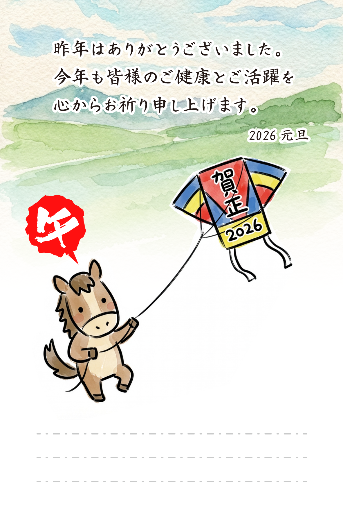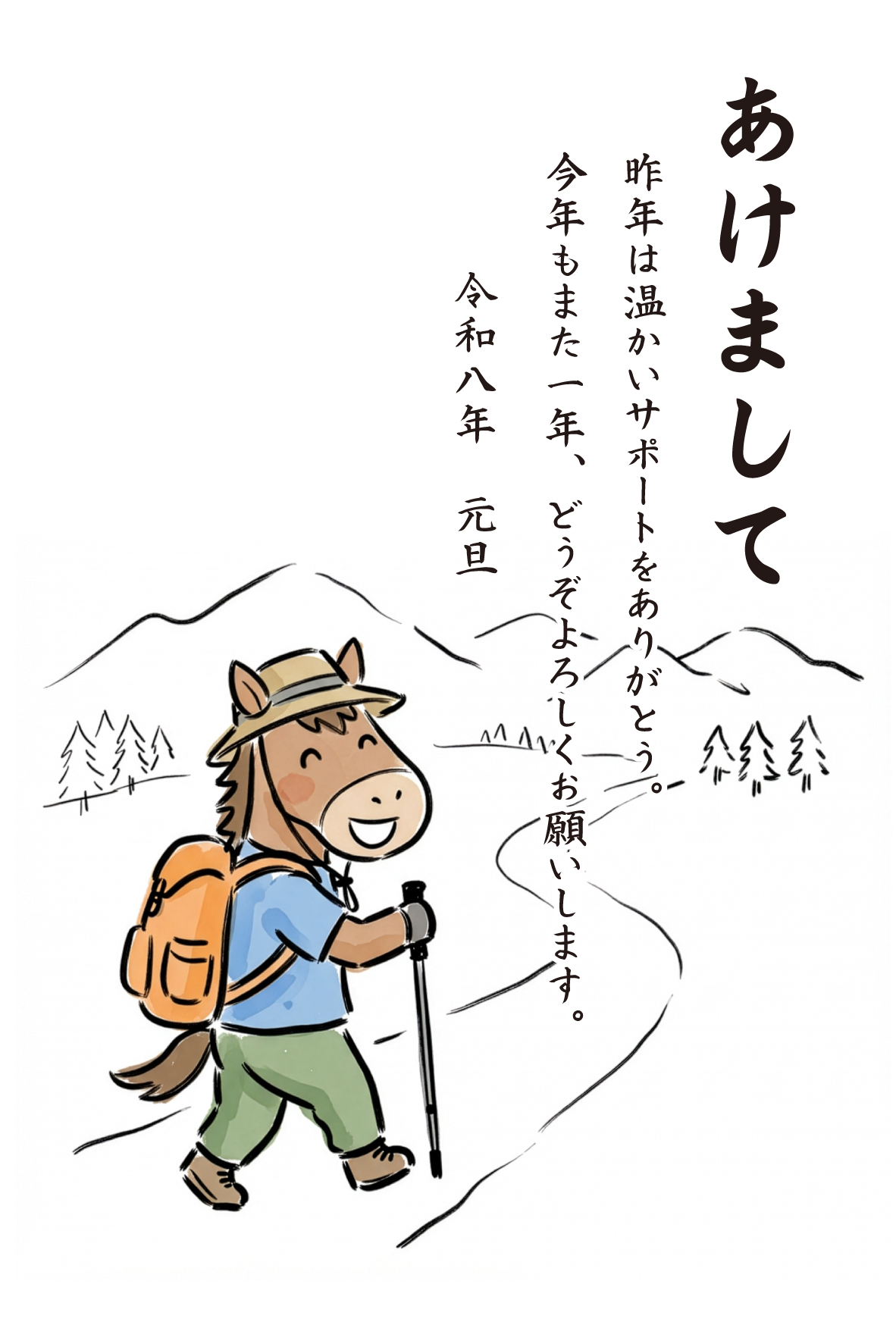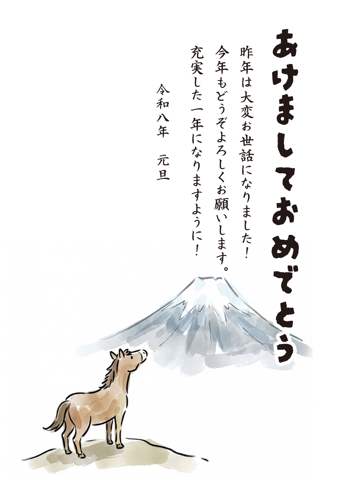 令和8年(2026年)の年賀状デザイン。雄大な富士山と干支の馬(午年)を描いた、シンプルで美しい和風テンプレートです。おしゃれな水彩タッチのイラストは、ビジネスから個人まで幅広く使えます。登録不要で今すぐ無料ダウンロード可能です。新年の挨拶にふさわしい、落ち着きと希望を感じさせる構図になっています。