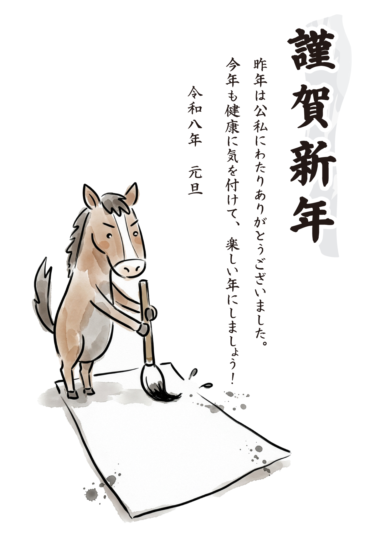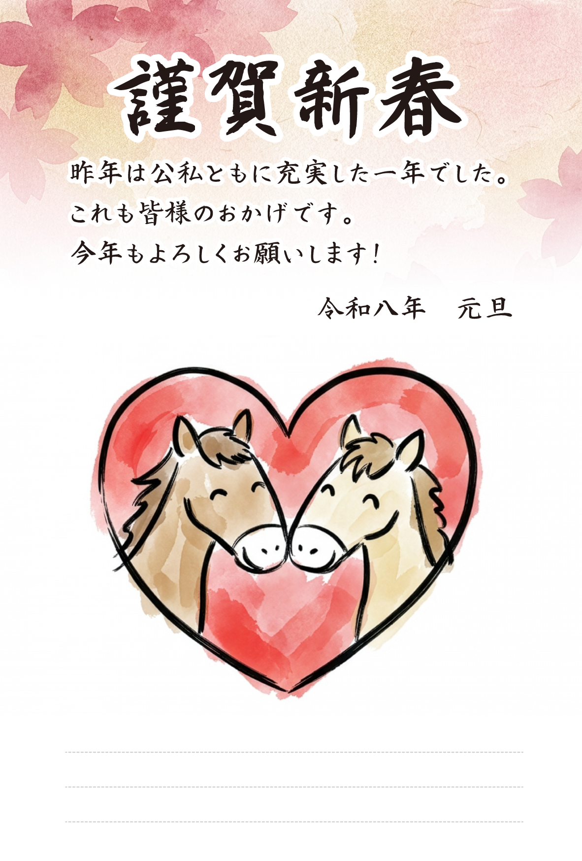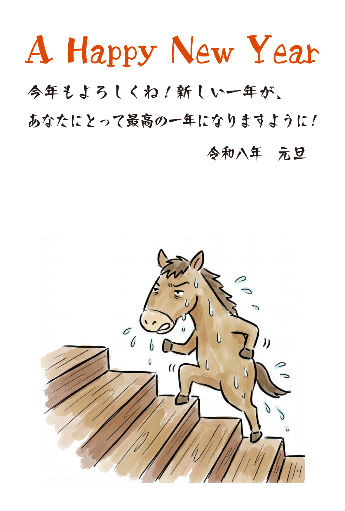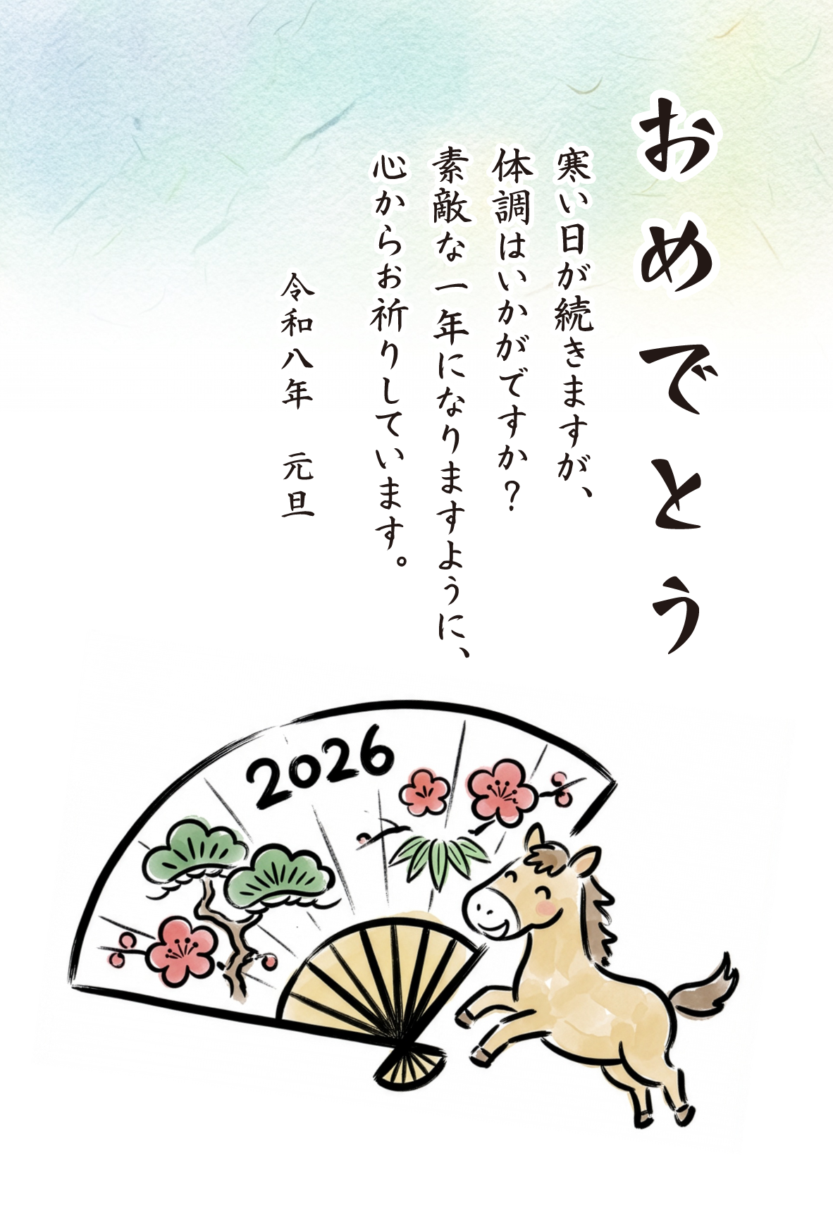 令和8年(2026年)の年賀状デザイン。雄大な富士山と干支の馬(午年)を描いた、シンプルで美しい和風テンプレートです。おしゃれな水彩タッチのイラストは、ビジネスから個人まで幅広く使えます。登録不要で今すぐ無料ダウンロード可能です。新年の挨拶にふさわしい、落ち着きと希望を感じさせる構図になっています。