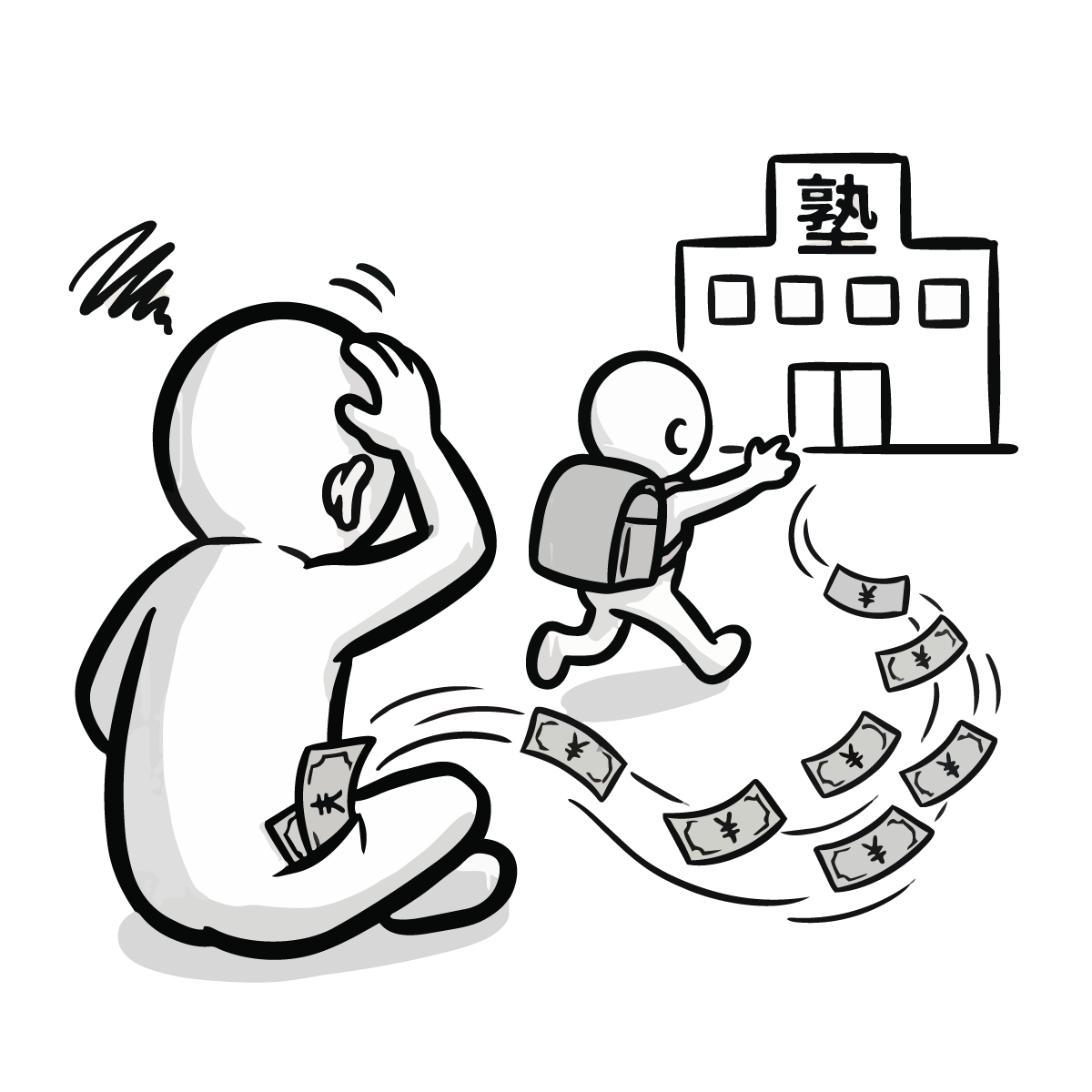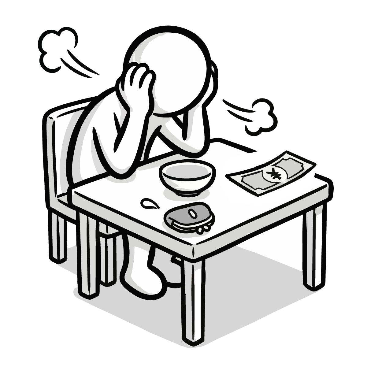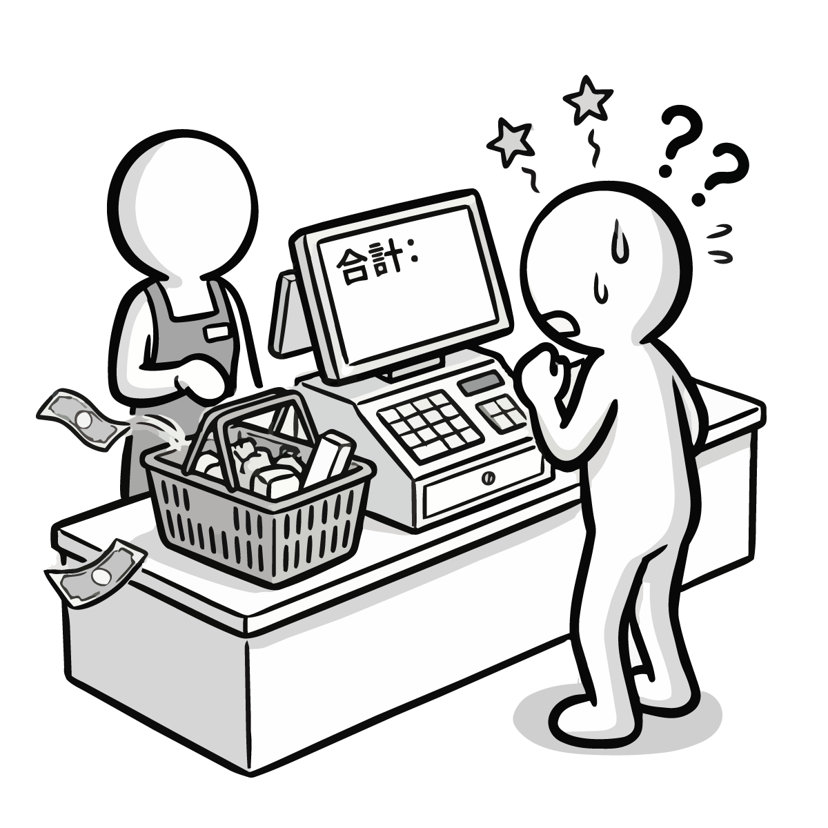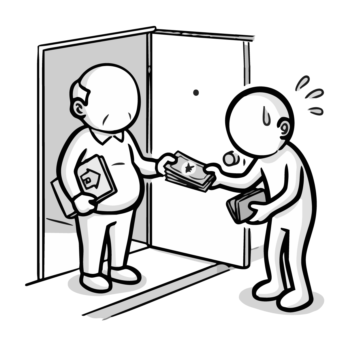 毎月の固定費である家賃の支払いに頭を悩ませるシーンを描いた手描き風の無料イラストです。大家さんに家賃を手渡す際、お財布が寂しくなり焦っている様子をシンプルでかわいいピクトグラム風のキャラクターで表現しました。生活費のやりくりや、固定費の負担といった家計の悩みをテーマにした記事にぴったりなフリー素材です。登録不要で簡単にダウンロードでき、商用OKなので、ビジネスサイトや個人のブログ作成など幅広い用途でご利用いただけます。
