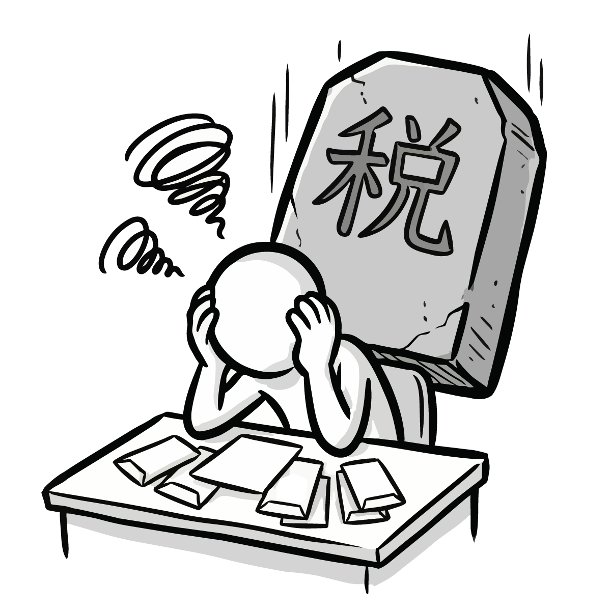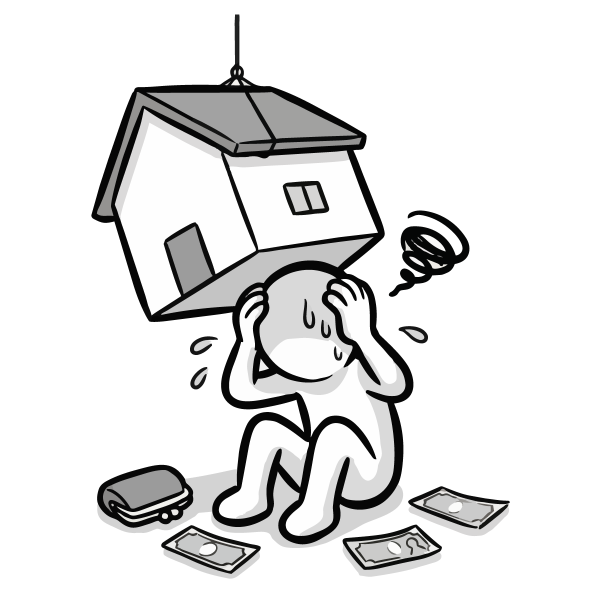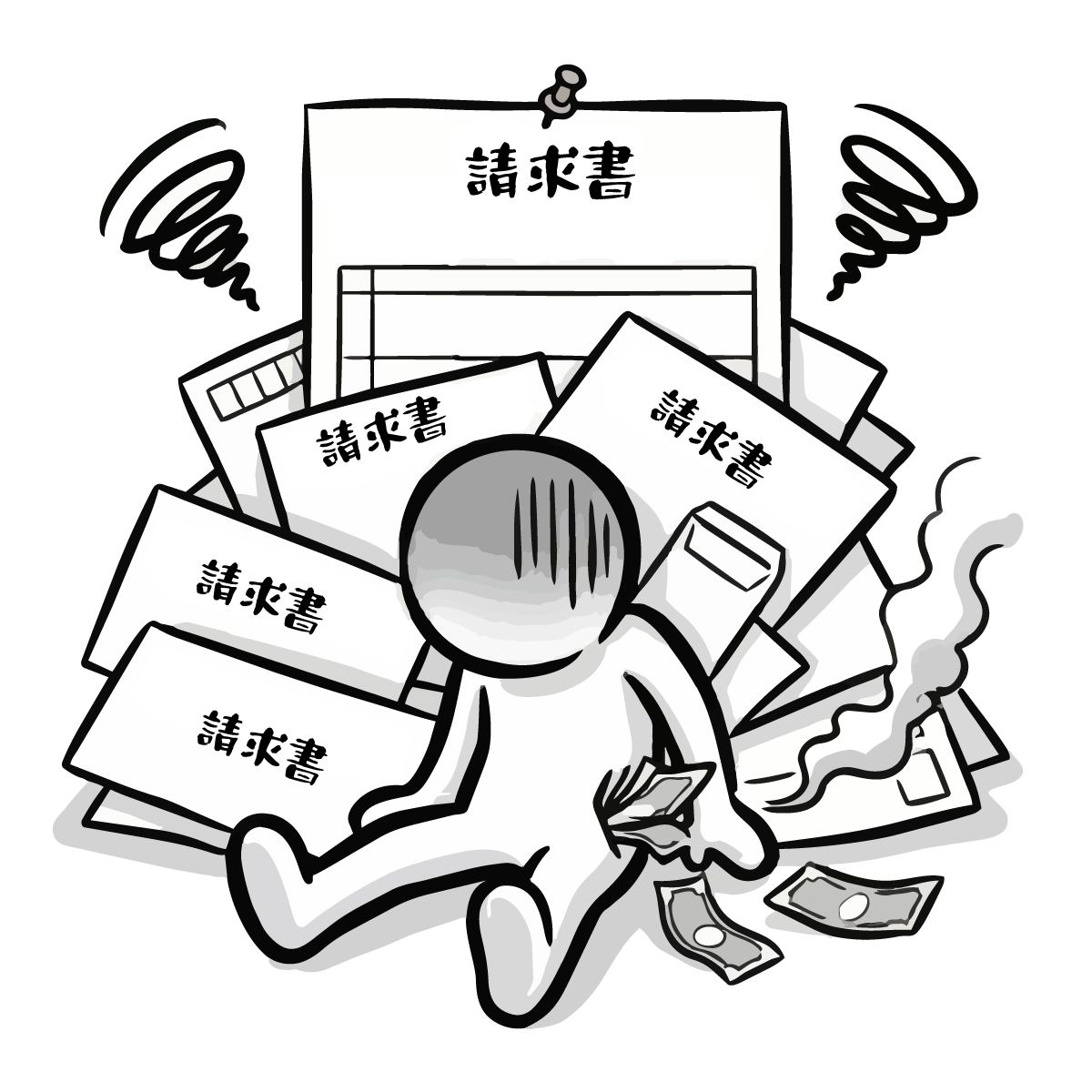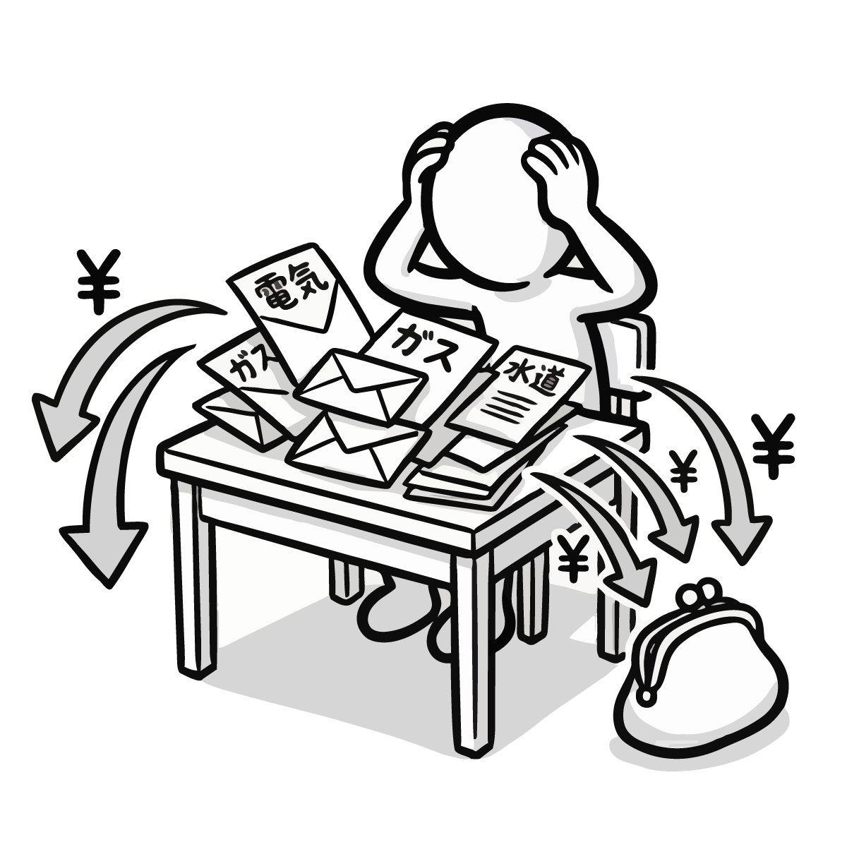 不動産関連のサイト制作や、家計見直しをテーマにしたブログの挿絵としておすすめです。シンプルでスタイリッシュなデザインのため、ファイナンシャルプランナーのプレゼンテーション資料用素材や、節約術を紹介するチラシ・ポスターにも適しています。背景が白なので印刷して社内報の一部に使用したり、デザイン制作のワンポイントアイコンとしても便利です。お金の支払いに疲弊する様子が直感的に伝わる画像です。