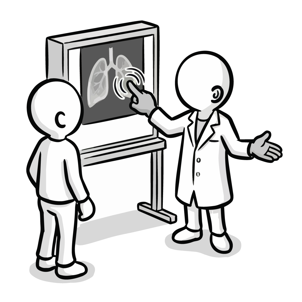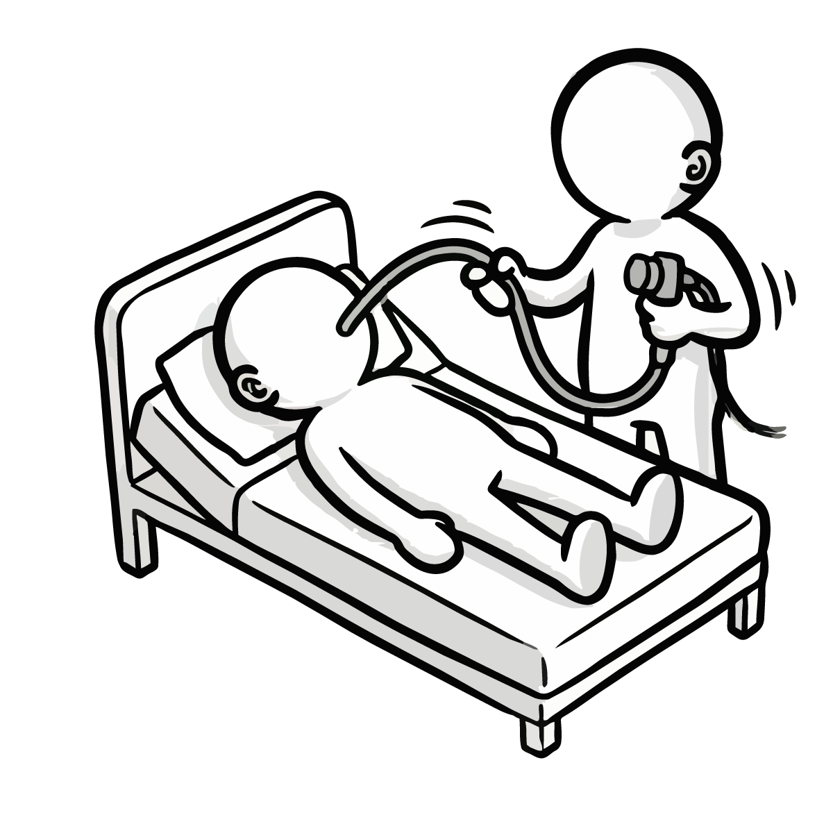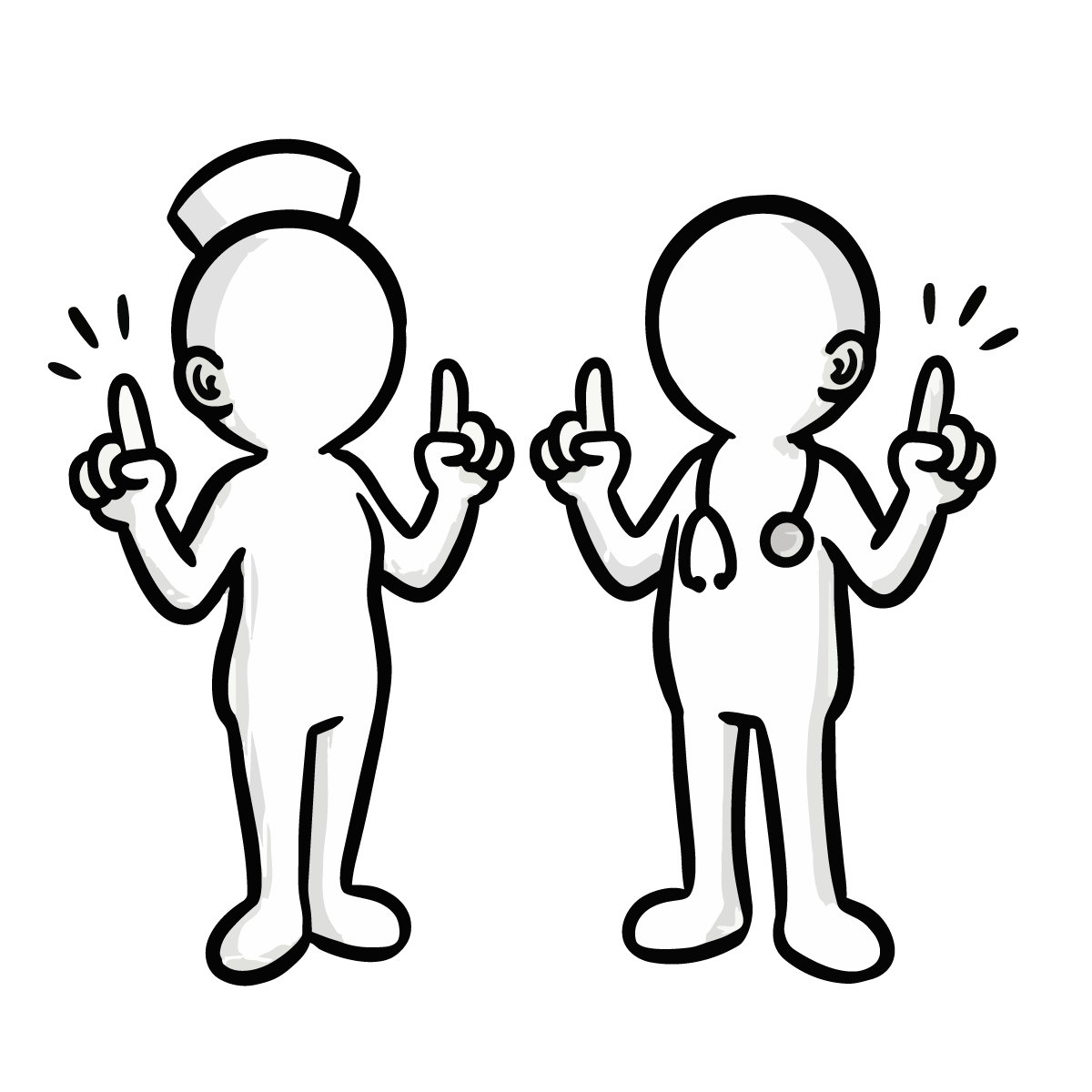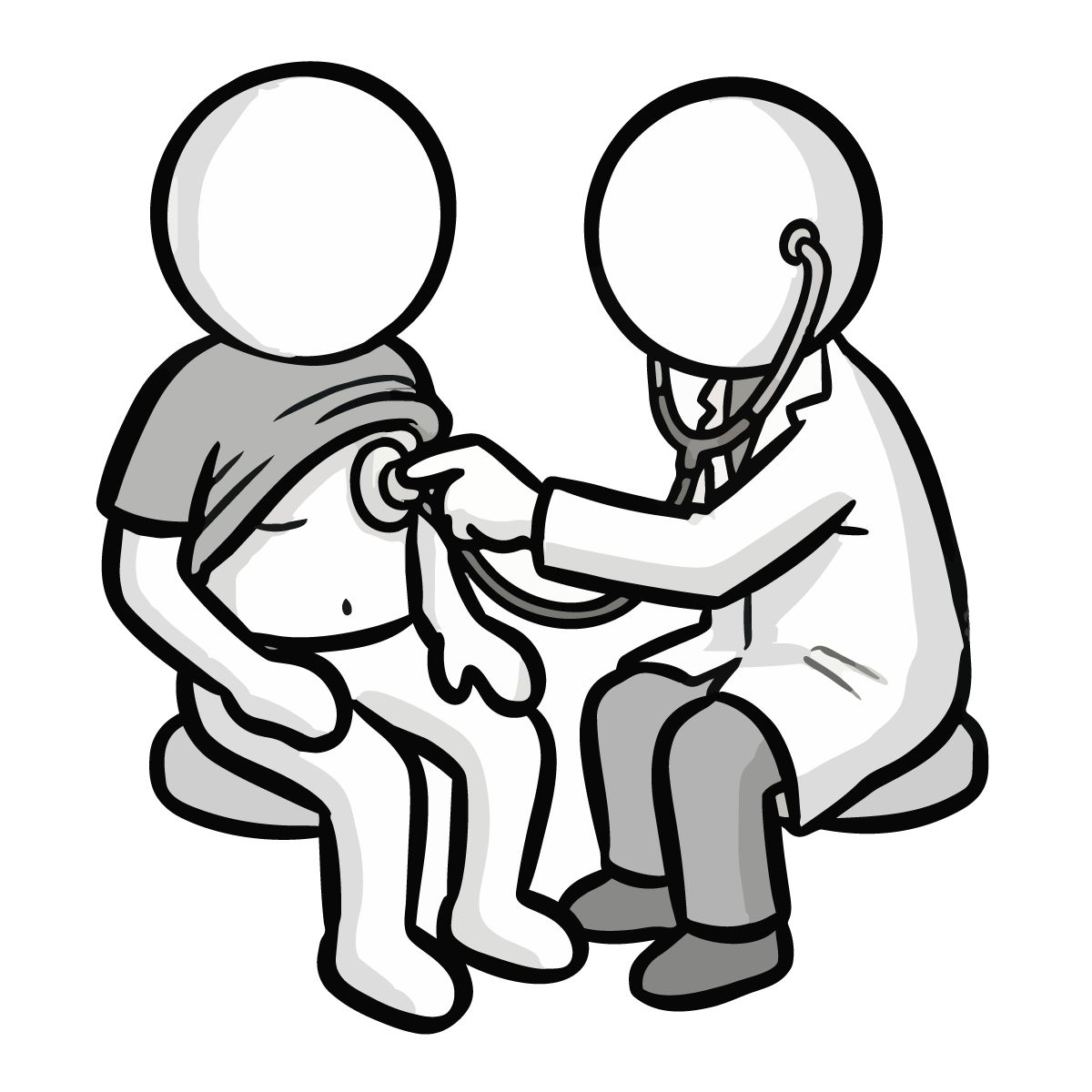 医師が患者の胸に聴診器を当てて診察をしているシーンを描いた、シンプルで手描き風の無料イラストです。健康診断や病院での問診風景を表現するのに最適なピクトグラム調のデザインとなっています。白黒のモノトーンカラーで構成されているため、どんな媒体にも馴染みやすく、スタイリッシュな印象を与えます。商用OK、登録不要でダウンロードでき、サイト制作やブログの挿絵としてすぐにご利用いただける便利なフリー素材です。医療関係のコラム記事などにも幅広くご活用いただけます。