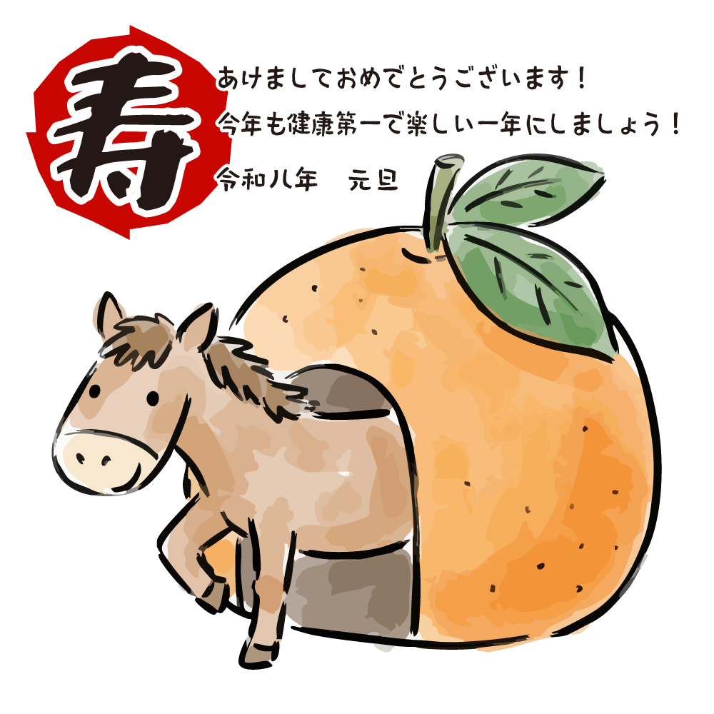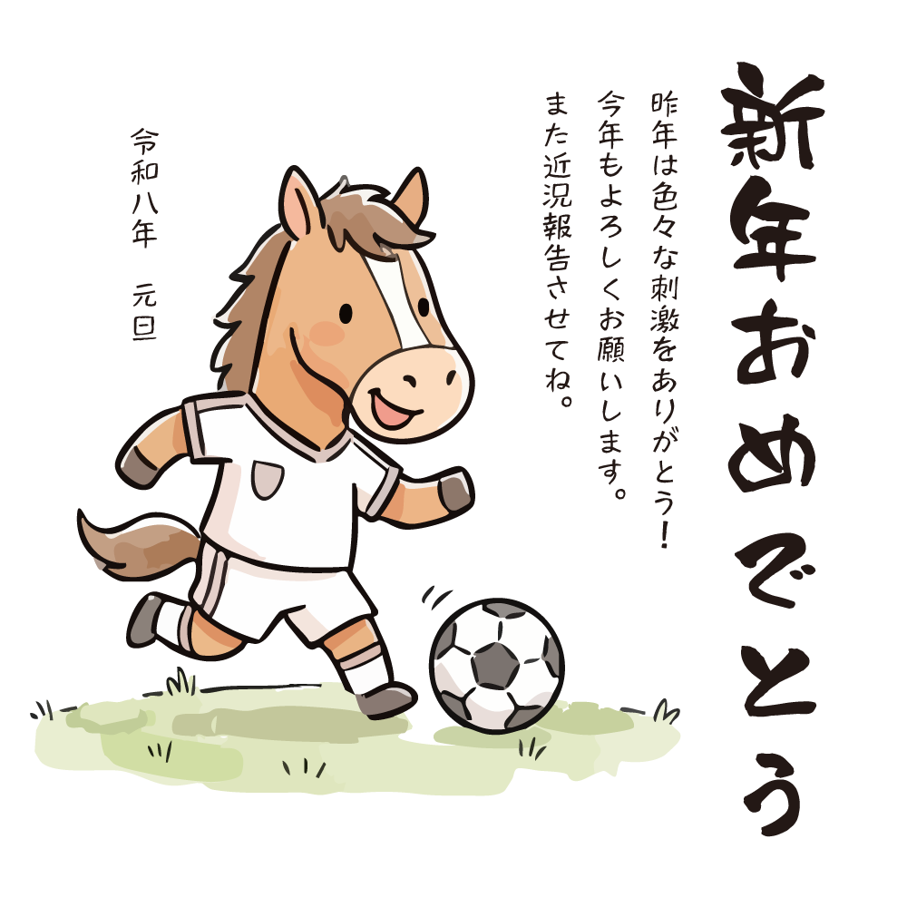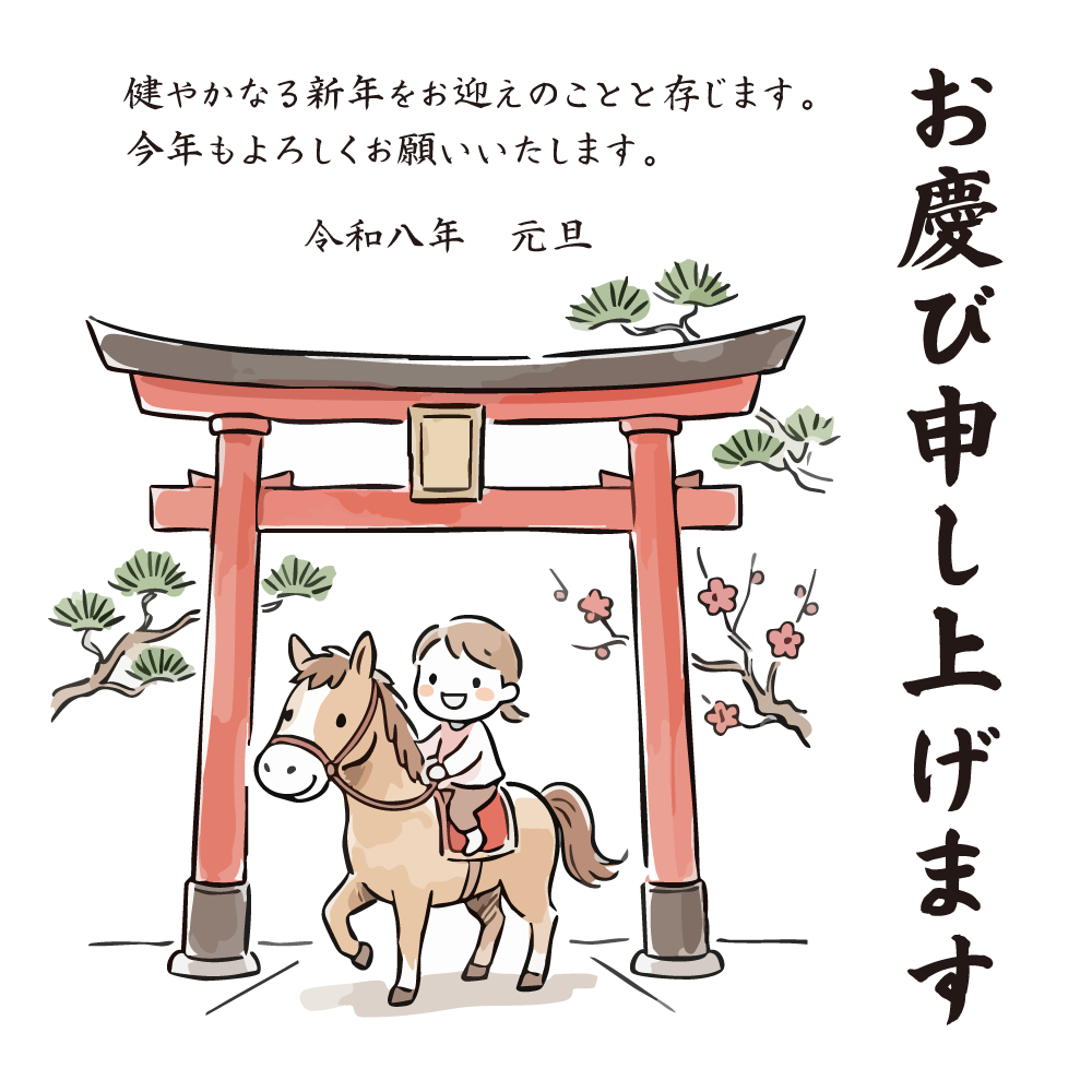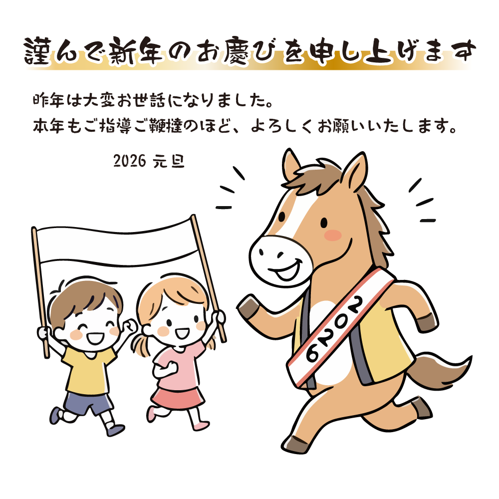 獅子舞をかぶった子供と楽しそうに踊る馬がかわいい、2026年(令和8年)の無料テンプレートです。賑やかで元気なデザインは、スマホやメールで送る新年の挨拶に最適。「昨年はありがとうございました」という汎用的な文面が入っており、LINEスタンプの代わりとして友人や家族へ気軽に送信できます。干支の午年ならではのイラストで、文例付きなので編集の手間なくそのまま画像で送ることが可能です。明るい配色がお正月気分を盛り上げます。