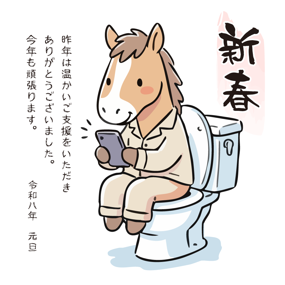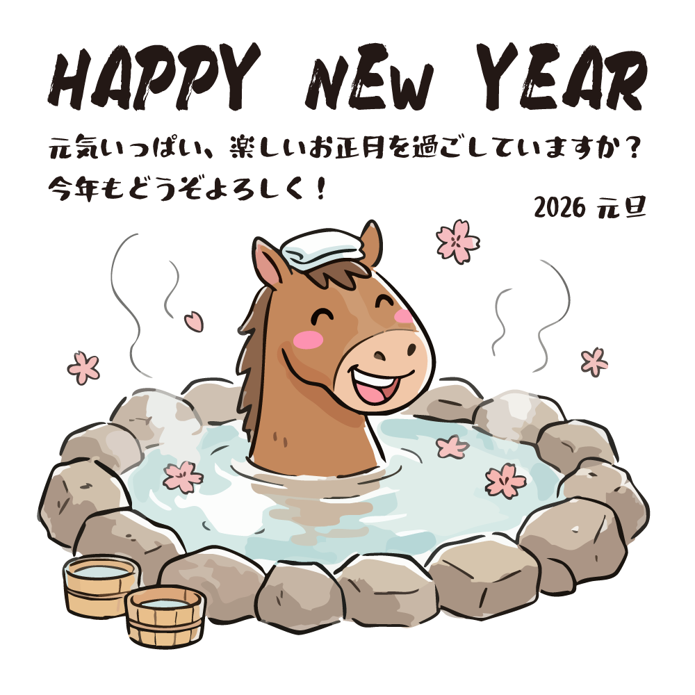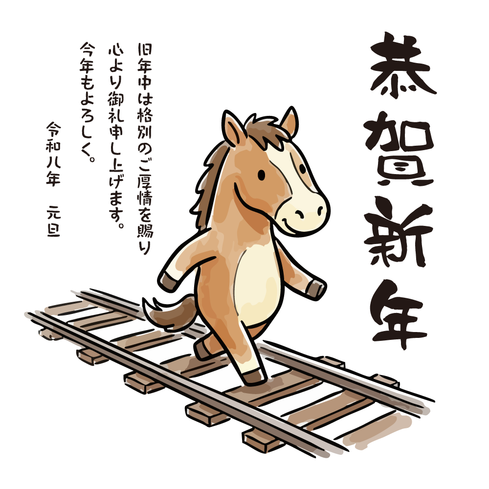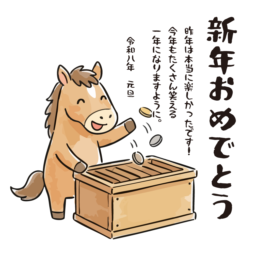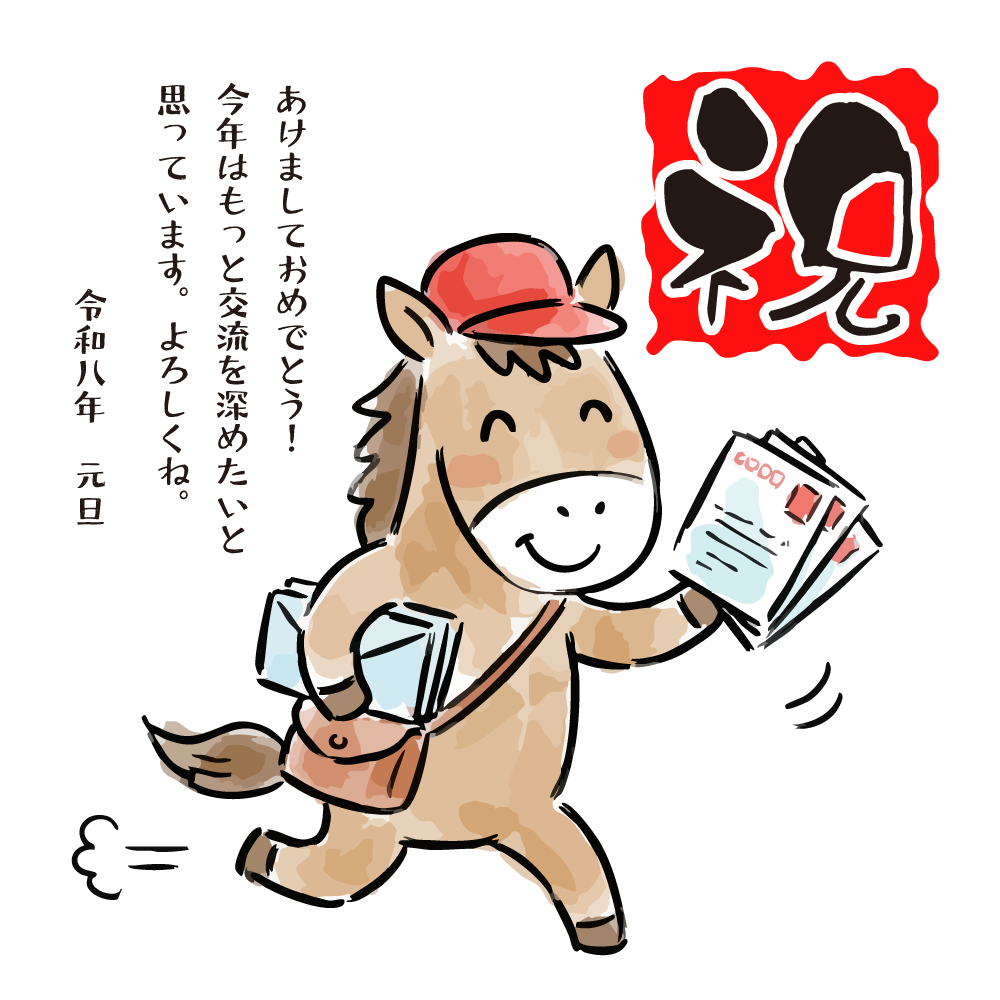 獅子舞をかぶった子供と楽しそうに踊る馬がかわいい、2026年(令和8年)の無料テンプレートです。賑やかで元気なデザインは、スマホやメールで送る新年の挨拶に最適。「昨年はありがとうございました」という汎用的な文面が入っており、LINEスタンプの代わりとして友人や家族へ気軽に送信できます。干支の午年ならではのイラストで、文例付きなので編集の手間なくそのまま画像で送ることが可能です。明るい配色がお正月気分を盛り上げます。