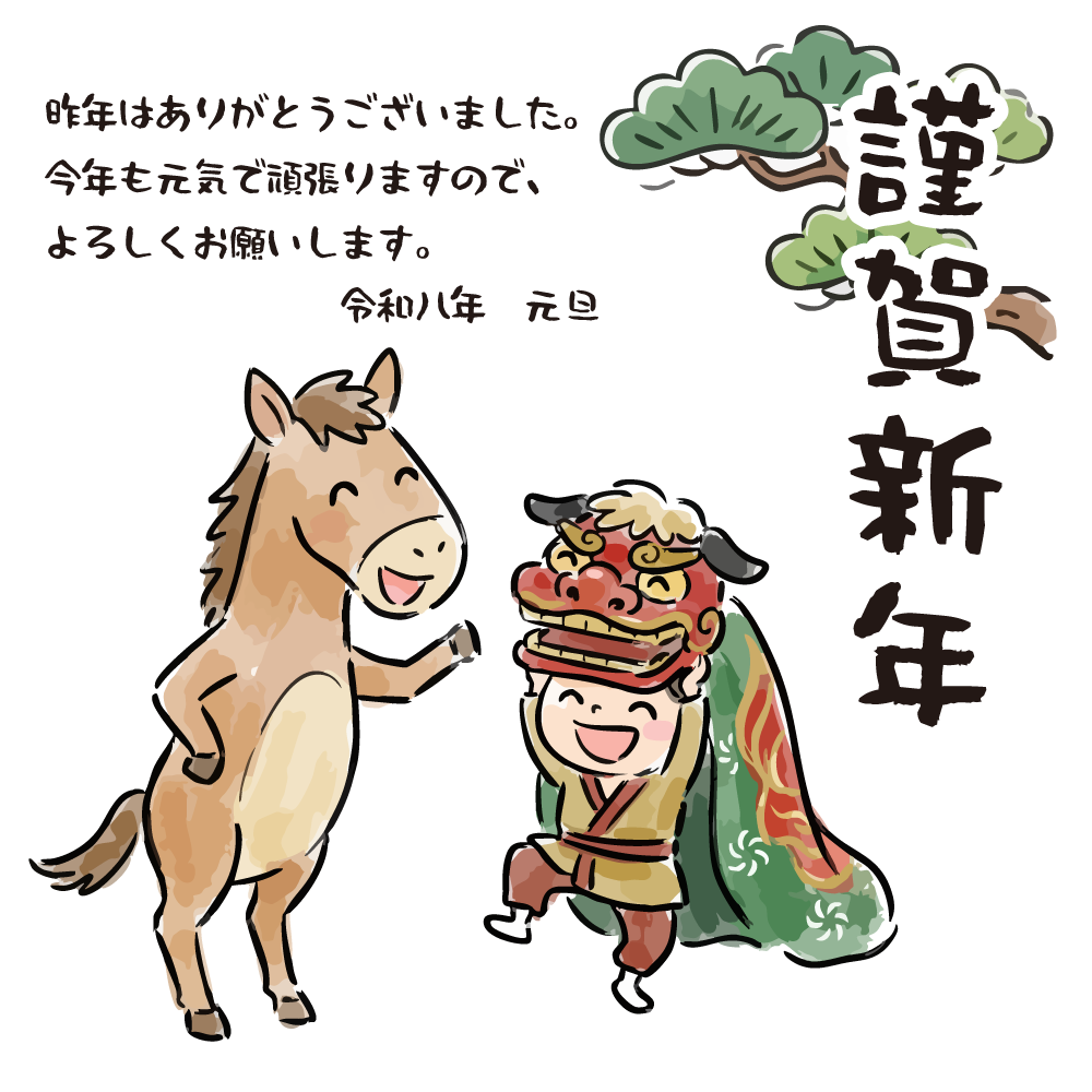 2026年午年・獅子舞と馬の楽しい年賀状イラスト